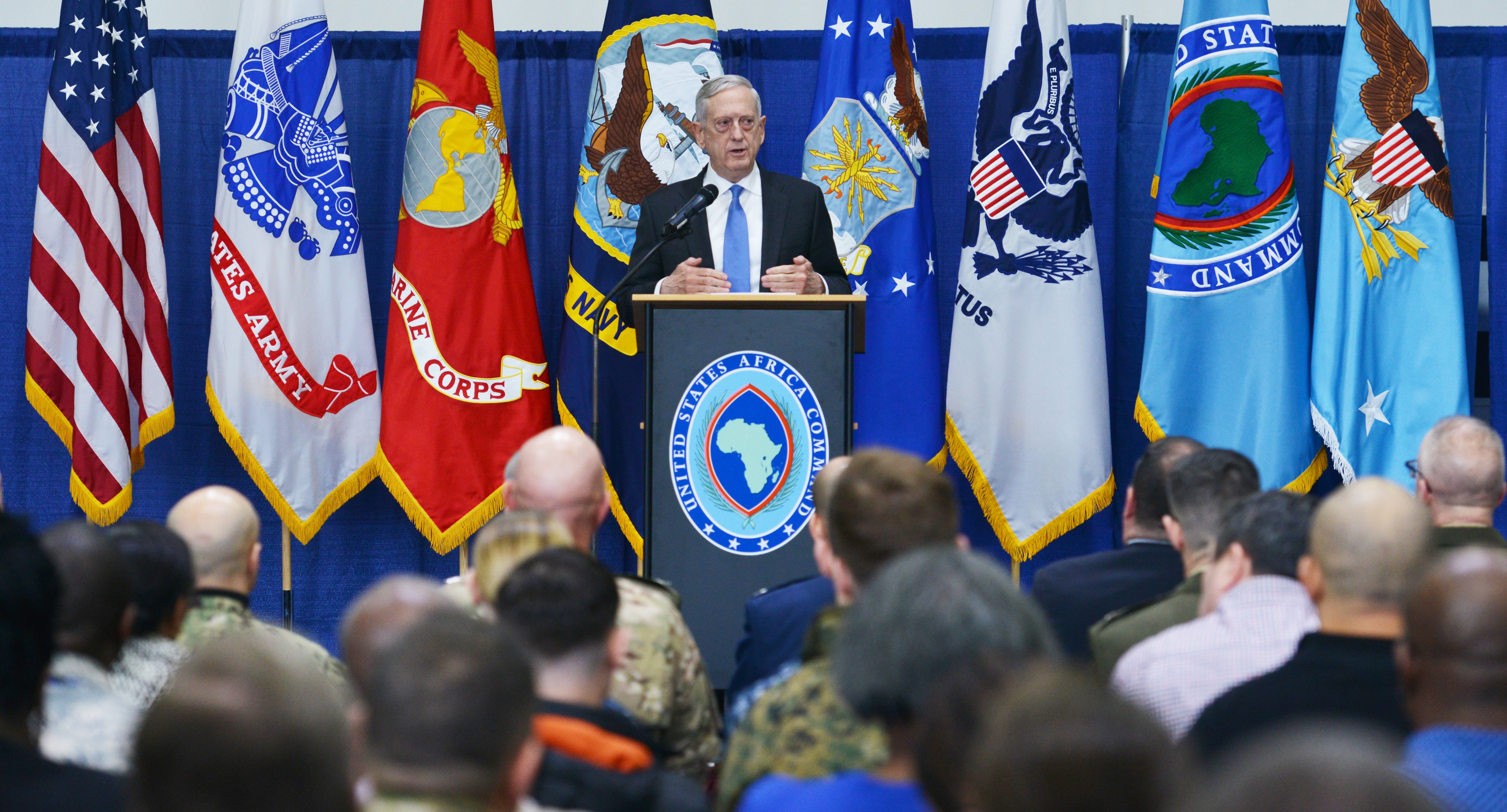 STUTTGART, Germany--Secretary of Defense James Mattis led a town hall meeting with military and civilian members of U.S. Africa Command, at Kelly Fitness Center during his visit to the command headquarters, Feb. 16, 2018. Secretary Mattis held a Q&A session following his address to attendees.