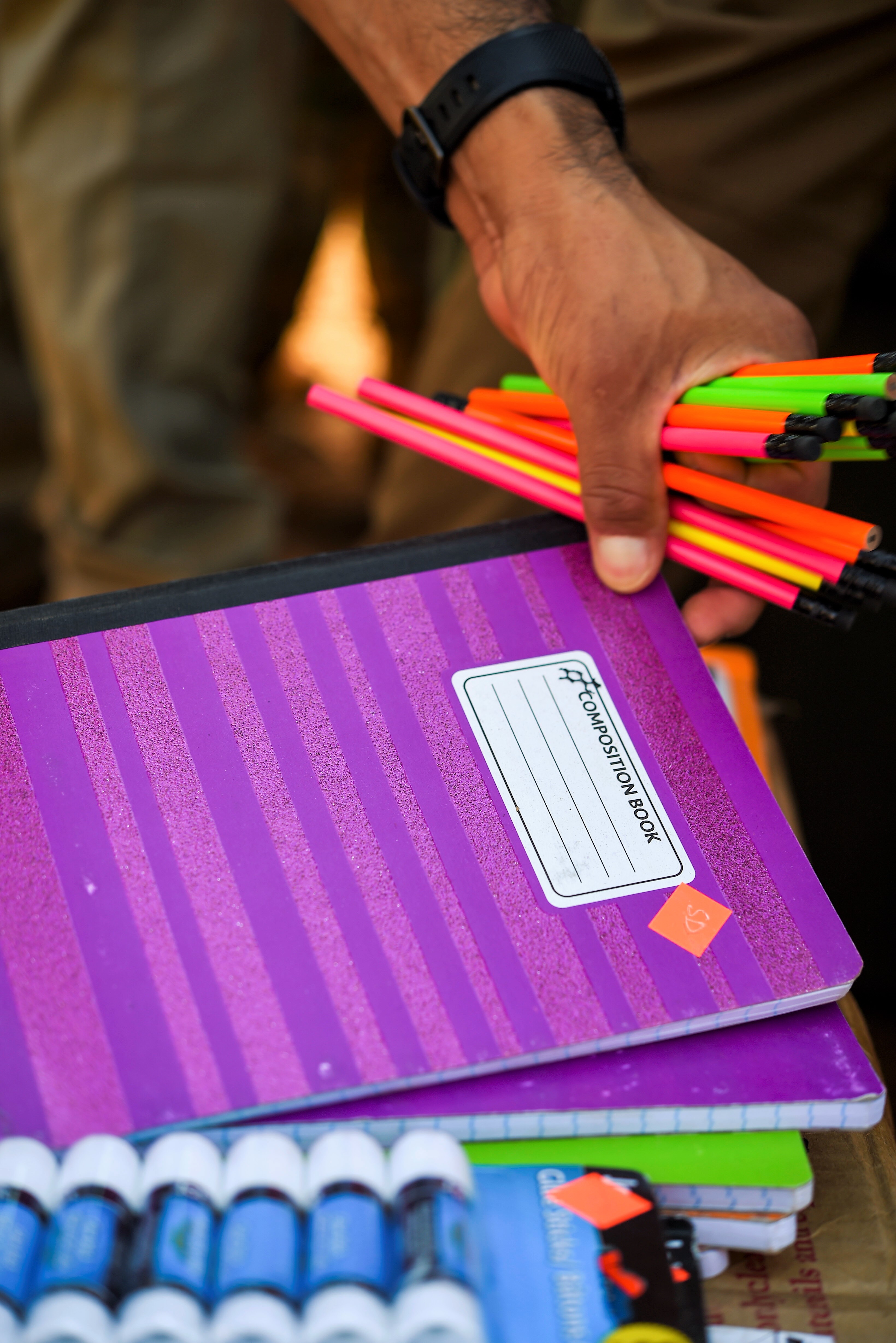 Animal Company, 3rd Battalion, 141st Infantry Regiment, assigned to Combined Joint Task Force - Horn of Africa (CJTF-HOA), pack school supplies into backpacks to be given to Somali children in Ali Oune, Djibouti, March 28, 2018. CJTF-HOA service members donated more than $400 of school supplies and sandals to Somali refugees in Djibouti. (U.S. Air Force photo by Staff Sgt. Timothy Moore)