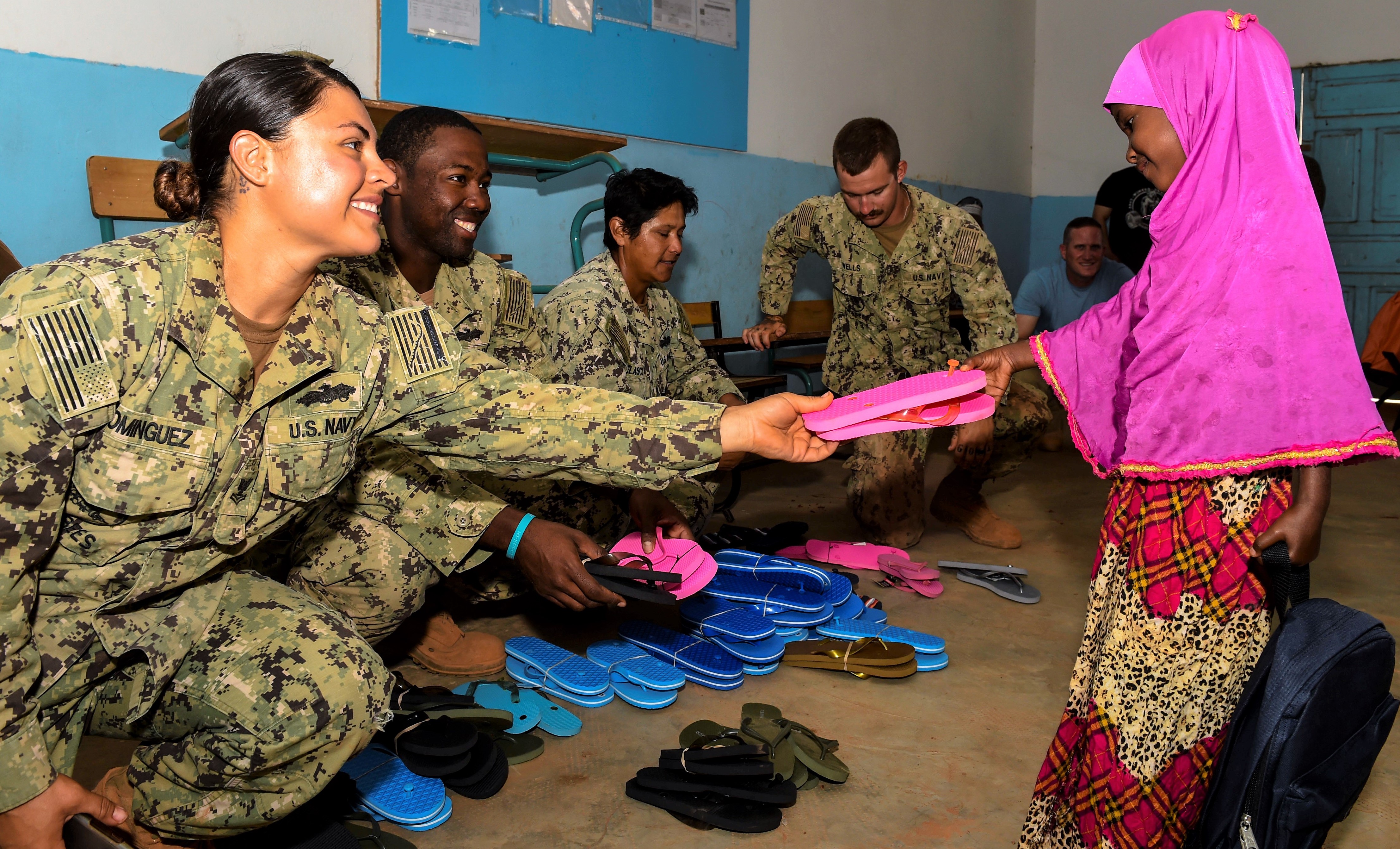 U.S. Navy Seabee Construction Electrician 2nd Class (CE2) Crystal Dominguez, with the Naval Mobile Construction Battalion 11 (NMCB 11) currently deployed to Camp Lemonnier, Djibouti, hand out sandals to Somali children in Ali Oune, Djibouti, March 28, 2018. Combined Joint Task Force - Horn of Africa service members donated more than $400 of school supplies and sandals to Somali refugees in Djibouti. (U.S. Air Force photo by Staff Sgt. Timothy Moore)