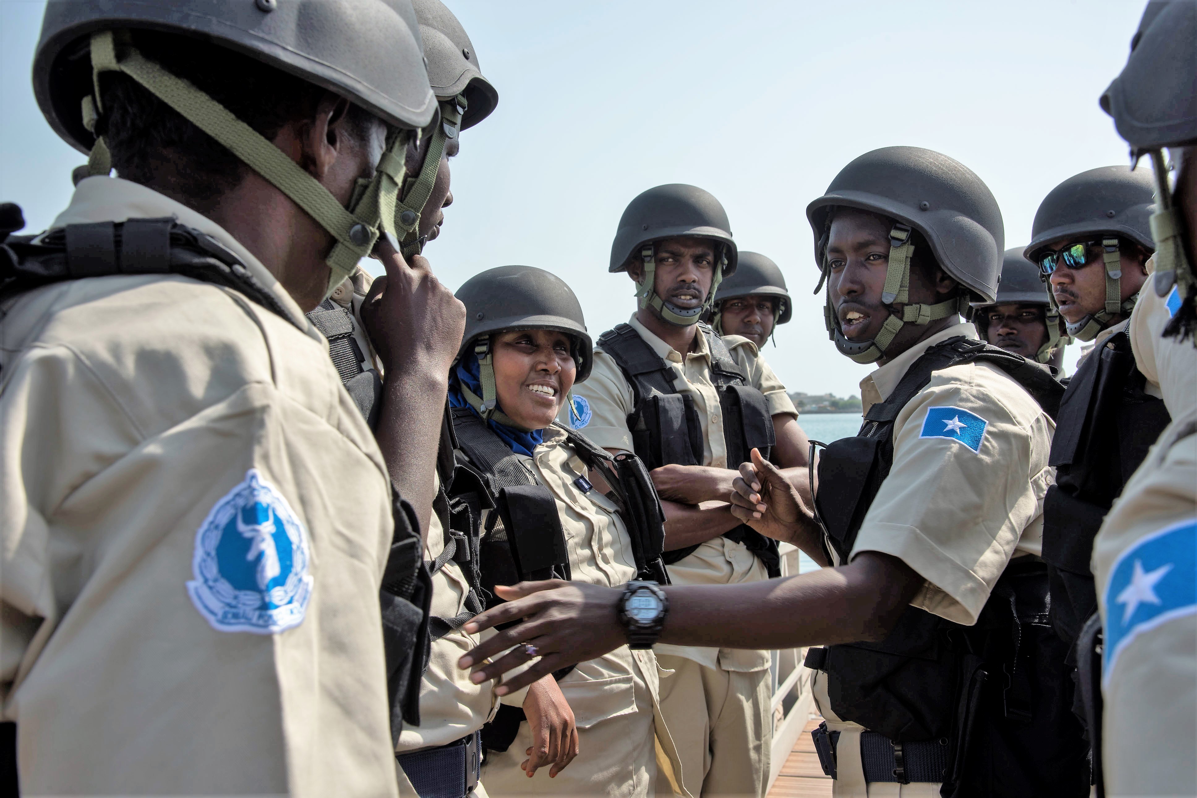 Somali maritime police talk together before running through a visit, board, search and seizure drill (VBSS) during exercise Cutlass Express 2018 in the Port of Djibouti Feb. 5, 2018. Cutlass Express is designed to improve cooperation, maritime domain awareness and information sharing practices to increase capabilities between the U.S., East African and Western Indian Ocean nations. (U.S. Air National Guard photo by SSgt Allyson Manners)