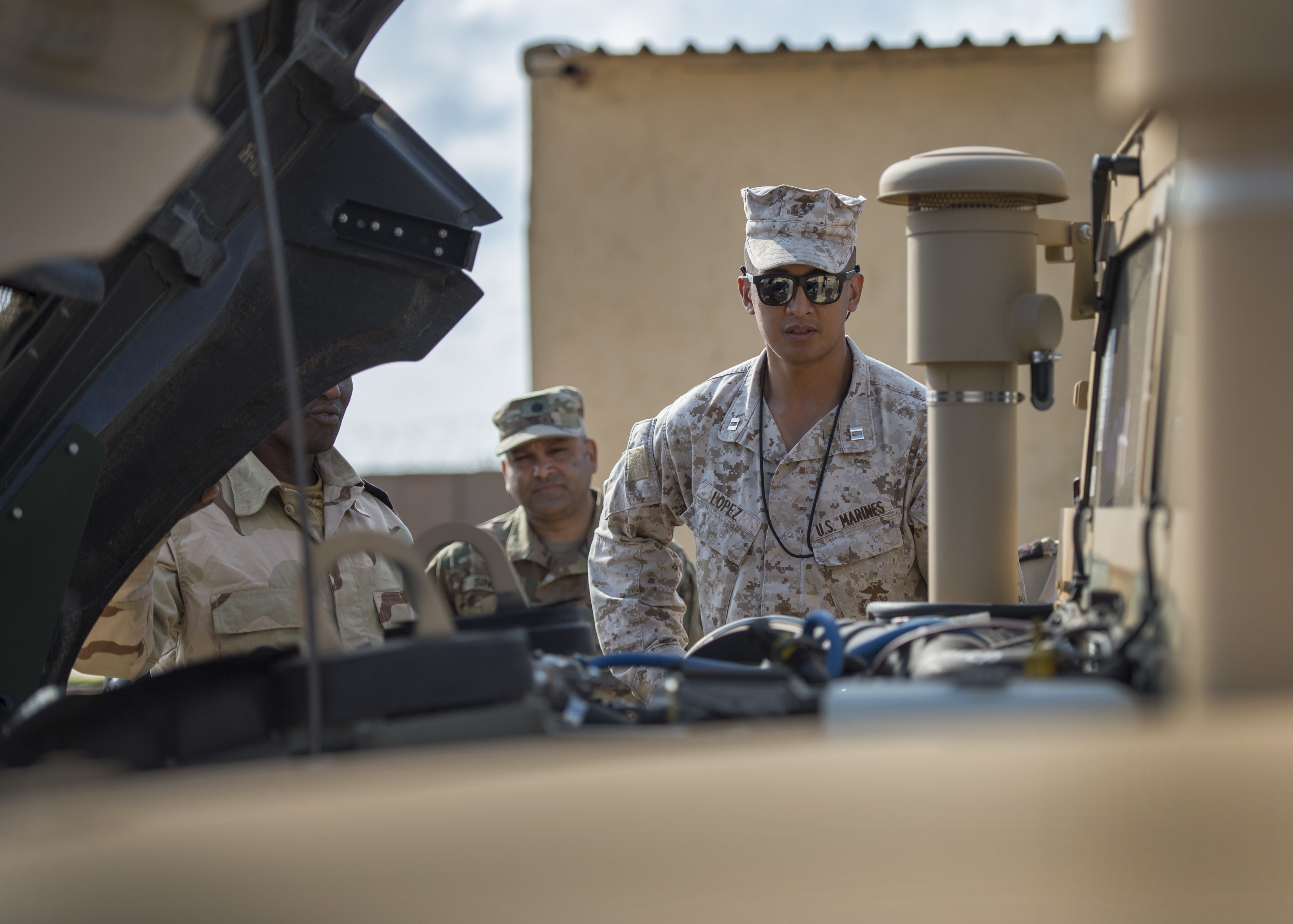 U.S. Marine Corps Capt. Adrian Lopez, Rapid Intervention Battalion (RIB) project officer assigned to CJTF-HOA, discusses the capabilities of a Humvee's engine with Djiboutian Armed Forces Maj. Mohamed Assowen, RIB commander, during the delivery of the Humvees to the RIB outside Djibouti City, Djibouti, on Dec. 26th. The U.S. delivered 54 Humvees to the RIB as part of a $31 million train-and-equip partnership between the U.S. government and the Djiboutian military. (U.S. Air Force Photo by Senior Airman Codie Trimble)