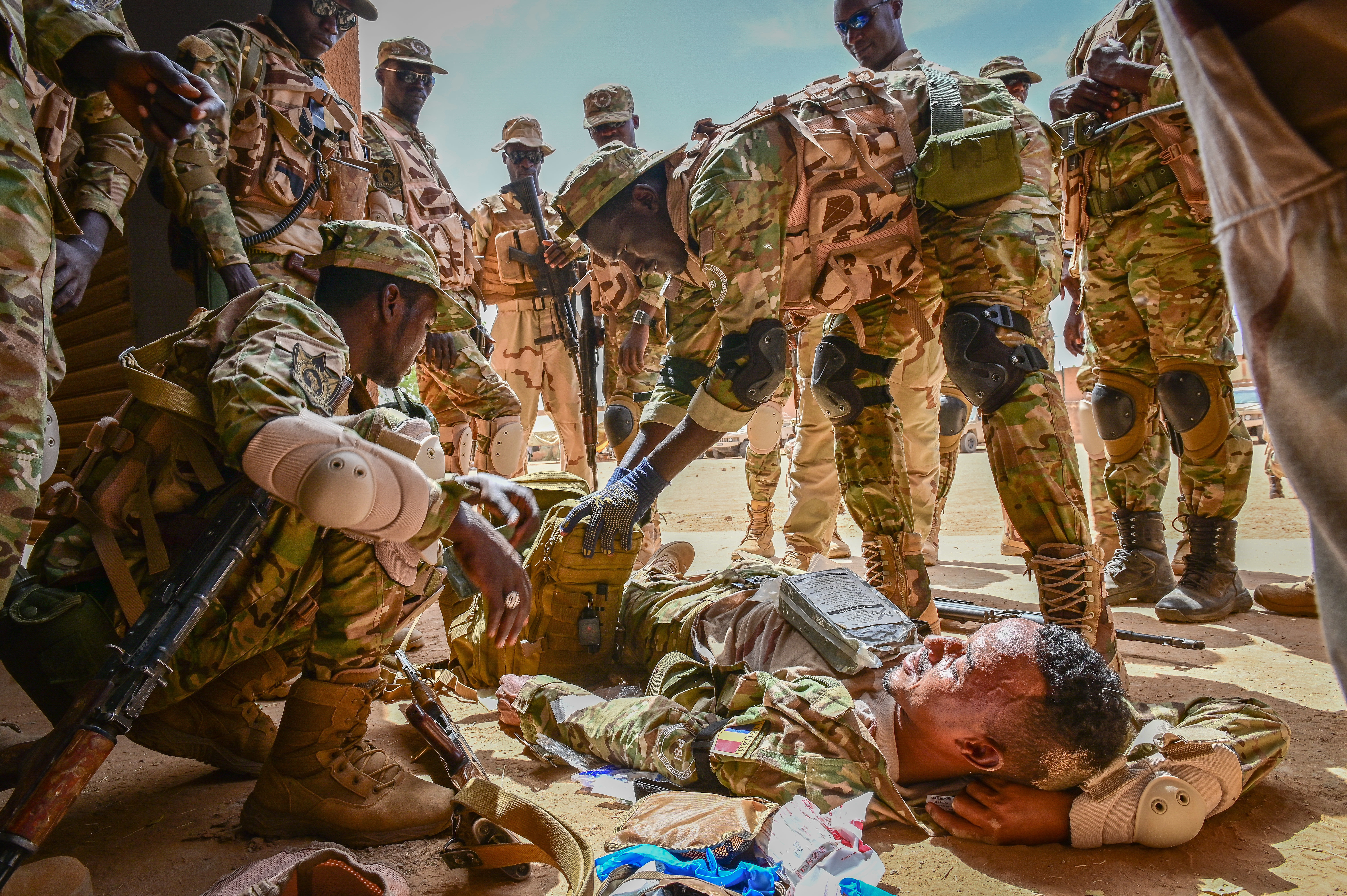 Forces Armées Tchadiennes soldiers train in tactical combat casualty care from their Sénégalese trainers near Kaedi, Mauritania, Feb. 19, 2020. This training teaches partner forces a variety of lifesaving skills in a realistic scenario, so that they are fully prepared to perform casualty care in a real situation. Flintlock is an annual, integrated military and law enforcement exercise that has strengthened key partner-nation forces throughout North and West Africa since 2005. Flintlock is U.S. Africa Command’s premier and largest annual Special Operations Forces exercise. (U.S. Army photo Sgt. 1st Class Caleb Barrieau)