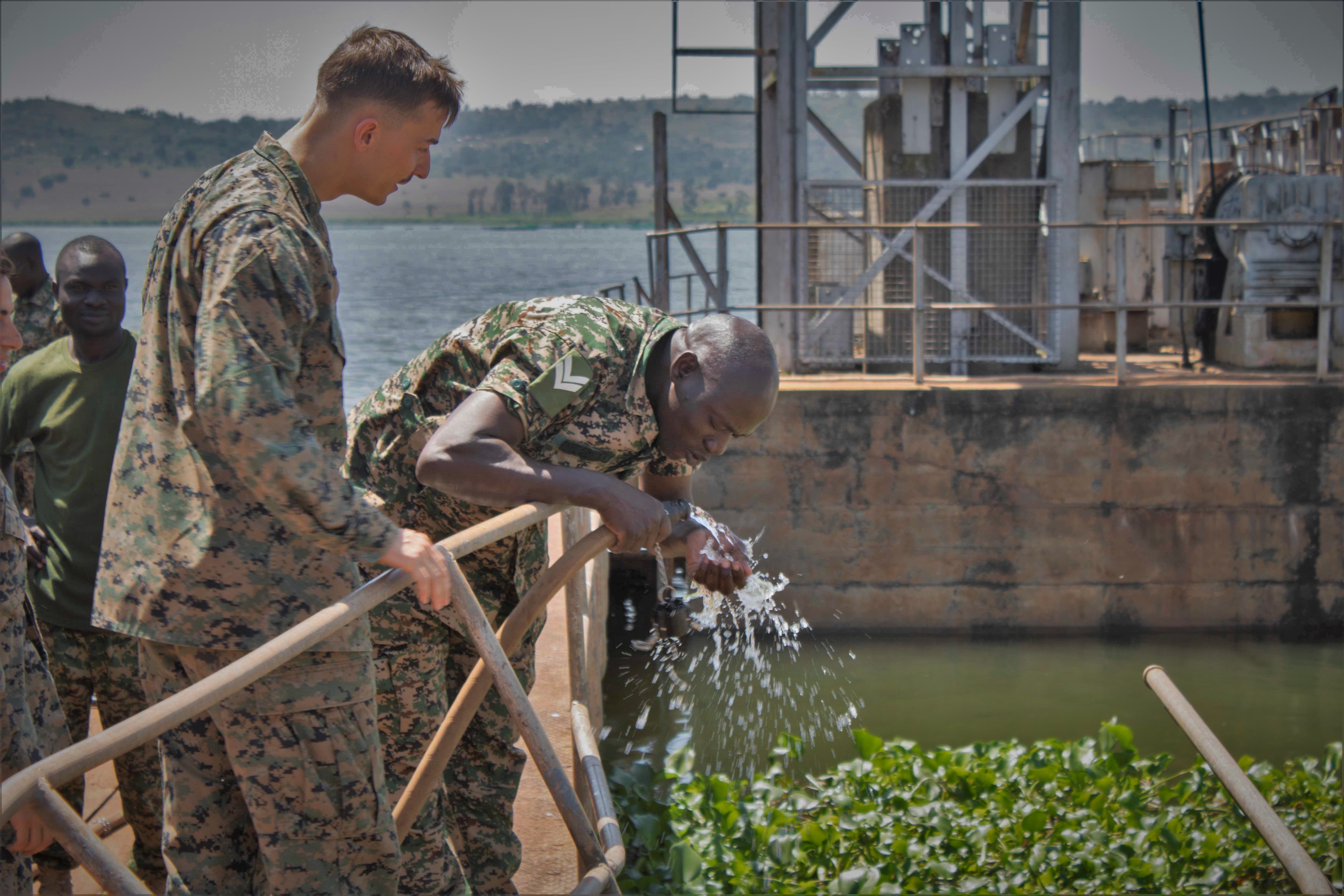 A U.S. Marine with Special Purpose Marine Air-Ground Task Force - Crisis Response - Africa 20.1, Marine Forces Europe and Africa, and members of the Uganda People’s Defence Force drink purified water from Lake Victoria after using a lightweight water purification system in Camp Jinja, Uganda, Feb. 10, 2020. SPMAGTF-CR-AF is deployed to conduct crisis-response and theater-security operations in Africa and promote regional stability by conducting military-to-military training exercises throughout Europe and Africa. (U.S. Marine Corps photo by 2nd Lt. Grace Jenkins)