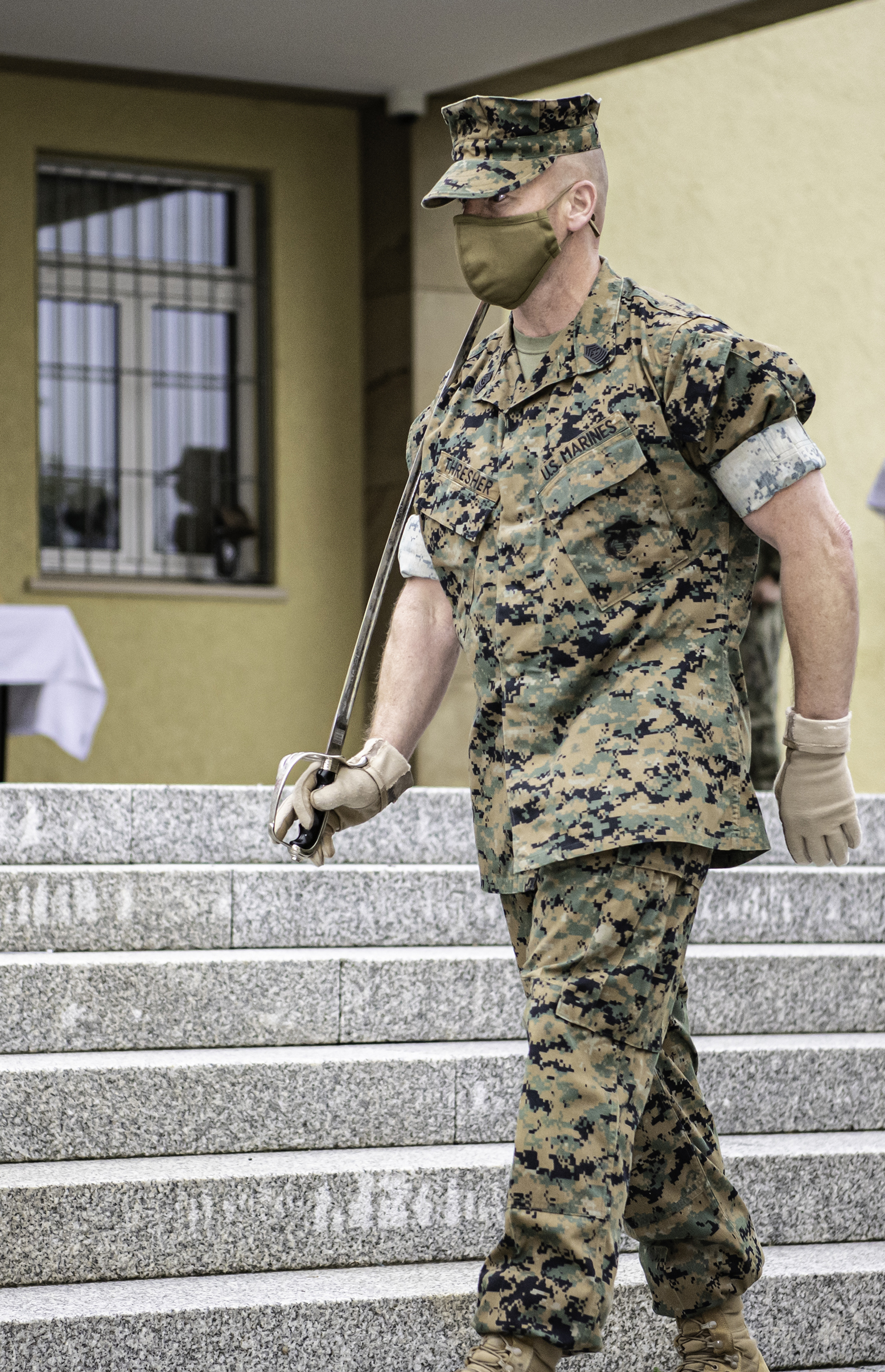 U.S. Marine Corps Sgt. Maj. Richard Thresher, command senior enlisted leader, U.S. Africa Command, smartly moves out to present the saber to be used in a cake-cutting tradition to commemorate the U.S. Army’s 245th birthday during a joint ceremony at Kelley Barracks in Stuttgart, Germany, Jun. 11. The U.S. Army was founded on June 14, 1775, when the Continental Congress authorized the enlistment of expert riflemen to serve the United Colonies for one year, according to the U.S. Army Center of Military History.