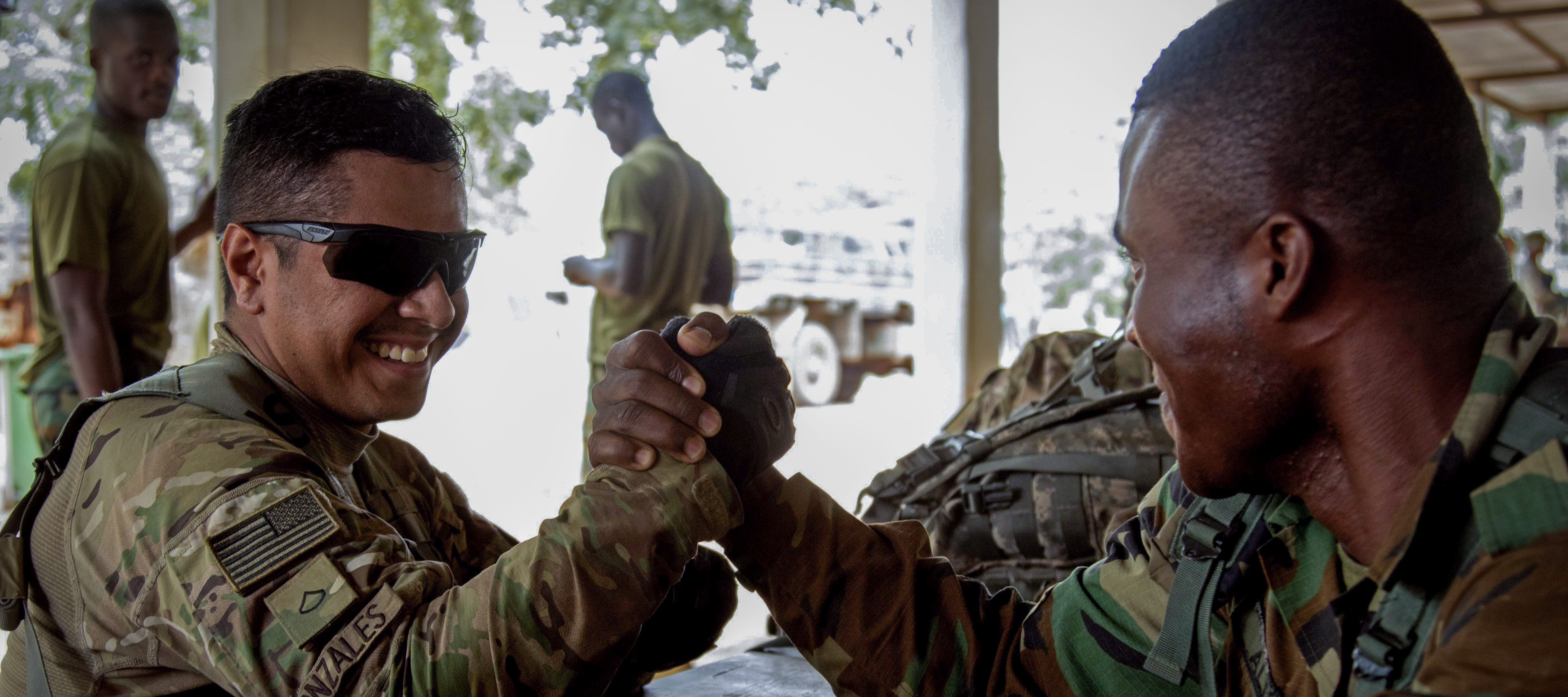 Soldiers from 36th Engineer Brigade and Ghana Armed Forces arm wrestle during downtime of United Accord at the Bundase Training Camp in Ghana July 27, 2018. United Accord, which is slated for execution in September 2020, is a Ghana Armed Forces and U.S. Army Africa exercise consisting of a command post, field, and medical training, and Jungle Warfare School.