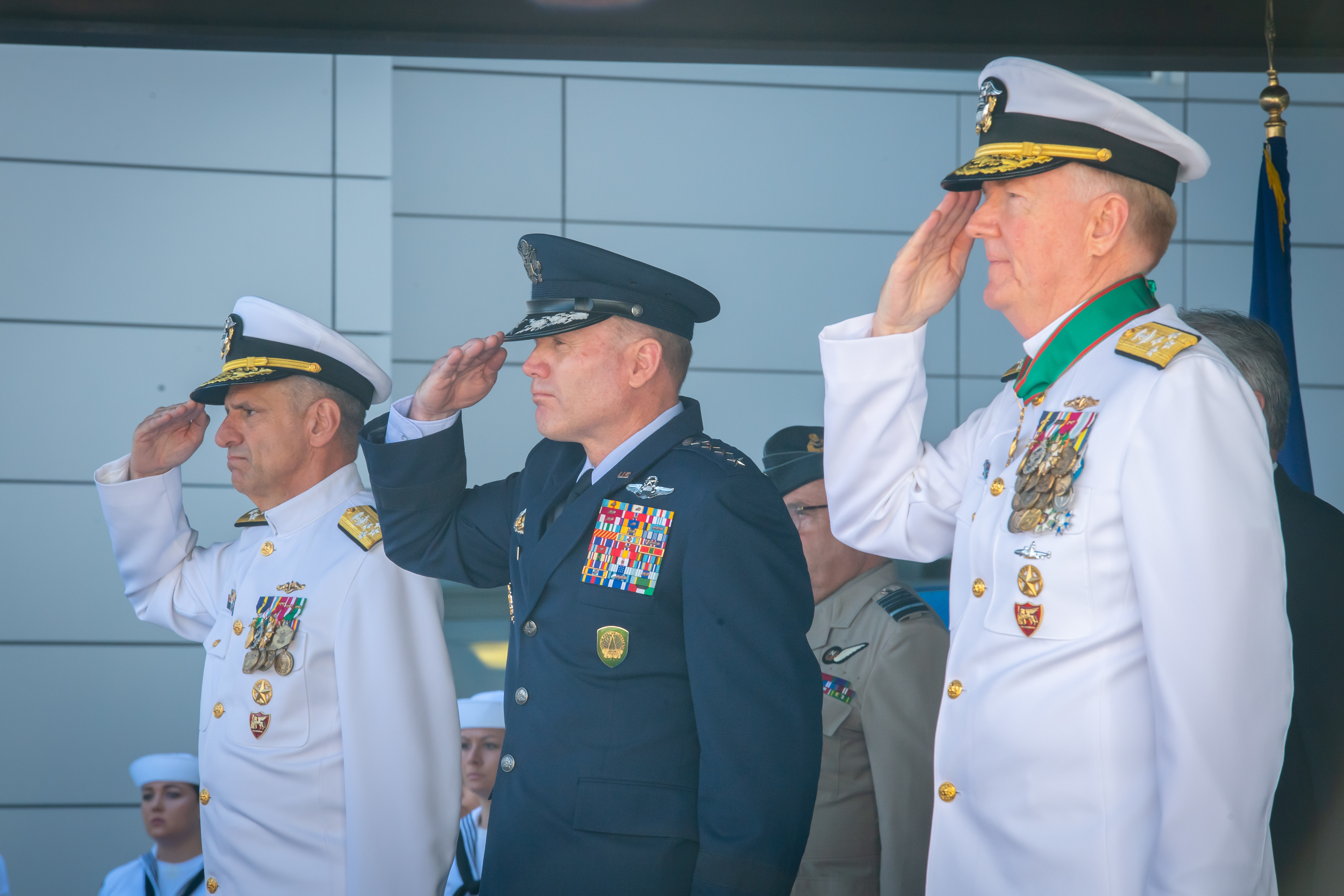 Adm. Robert P. Burke, Gen. Tod D. Wolters, commander, U.S. European Command and Supreme Allied Commander Europe, and Adm. James G. Foggo III, commander, U.S. Naval Forces Europe-Africa and commander, Allied Joint Force Command-Naples, salute the colors during the U.S. Naval Forces Europe-Africa, Allied Joint Force Command change of command ceremony. Adm. Foggo was relieved by Adm. Robert P. Burke at Allied Joint Force Command (JFC) Naples, Italy, July 17, 2020. U.S. Naval Forces Europe-Africa, headquartered in Naples, Italy, conducts the full spectrum of joint and naval operations, often in concert with allied and interagency partners, in order to advance U.S. national interests and security and stability in Europe and Africa.