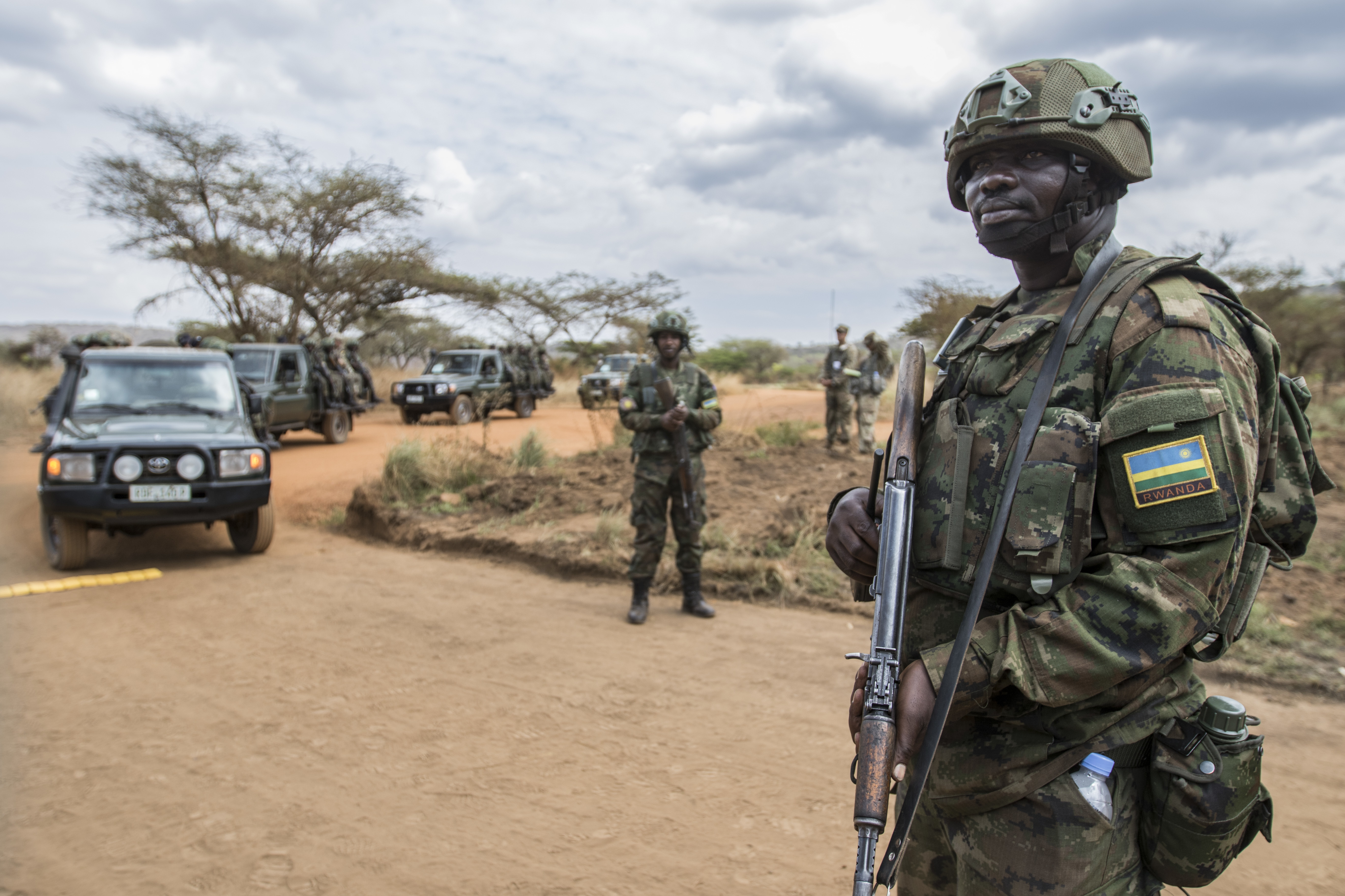 Members of the Rwanda Defence Force guard the entry control point during the field training exercise of Exercise Shared Accord 2019, in Gabiro, Rwanda, Aug. 26, 2019. SA 19, which runs Aug. 14-28, is focused on bringing together U.S. and Rwandan forces, African partner militaries, allies and international organizations to increase readiness, interoperability, and partnership building between participating nations for peacekeeping operations in the Central African Republic. (U.S. Army Reserve photo by Sgt. Heather Doppke/79th Theater Sustainment Command)