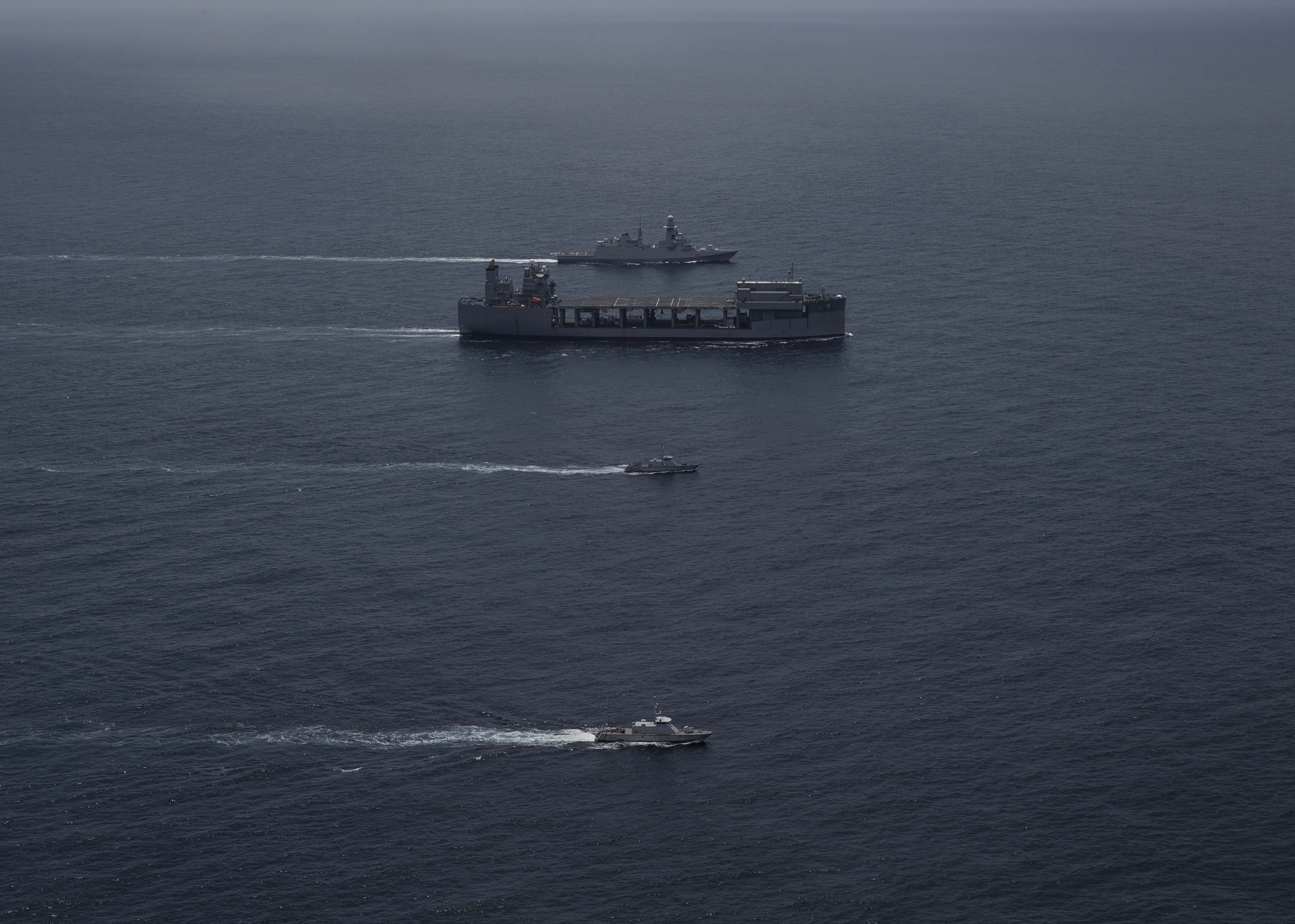 The Expeditionary Sea Base USS Hershel “Woody” Williams (ESB 4), right center, conducts a tracking exercise with Ivorian Navy ships OPV C.F. Sekongo and OPV L’Emergence and Italian Navy frigate ITS Federico Martinengo (F 596), right, in the Gulf of Guinea, Sept. 26, 2020. Hershel “Woody” Williams is on its inaugural deployment in the U.S. Naval Forces Europe-Africa area of responsibility in support of maritime missions and special operations.