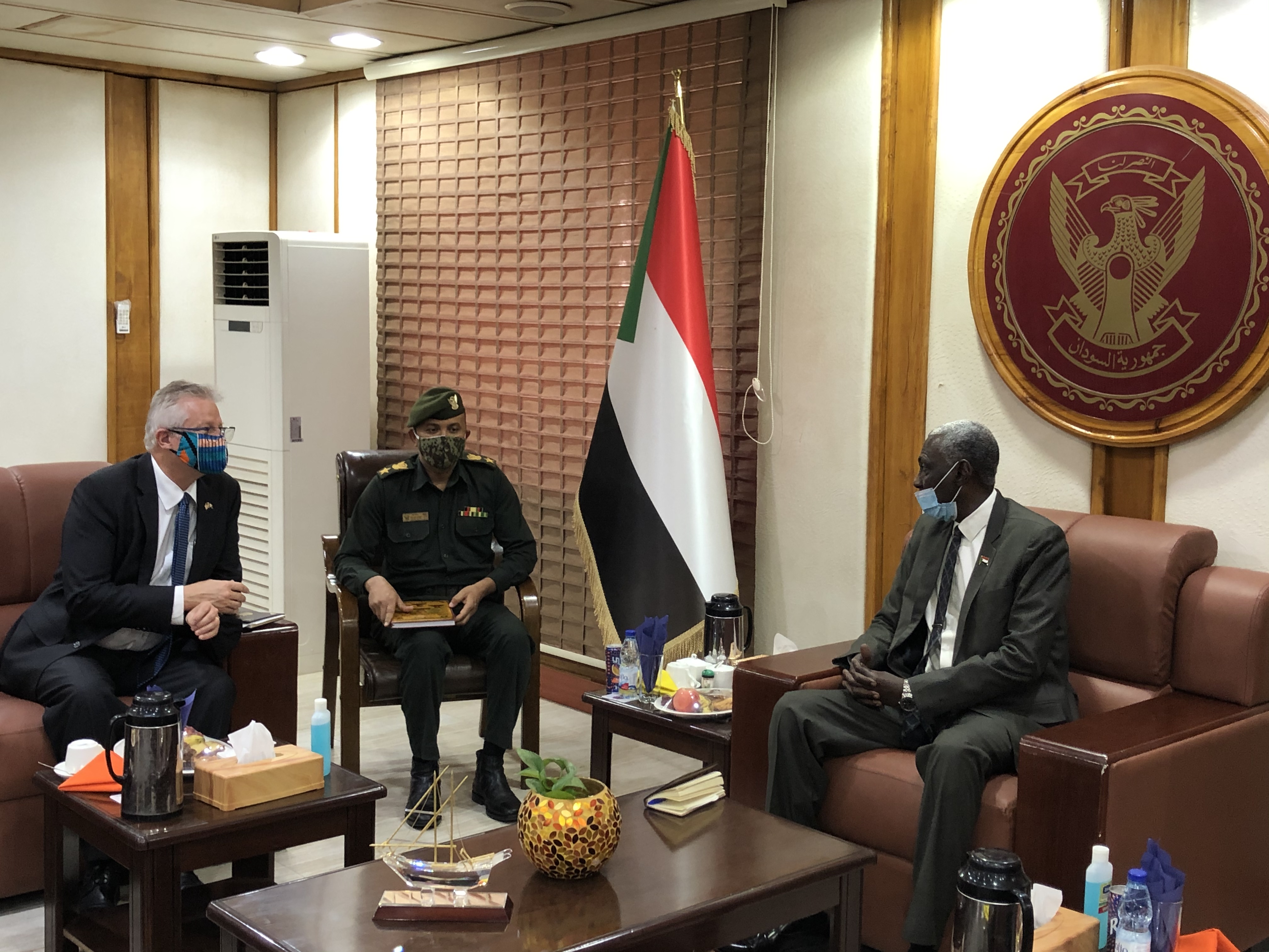 Ambassador Andrew Young, deputy to the commander for Civil-Military Engagement, meets with Maj. Gen. Yassin Ibrahim Yassin during a series of meetings with key military and government officials the week of Jan. 25, 2021. Young and U.S. Navy Rear Adm. Heidi Berg, U.S. Africa Command director of intelligence, conducted the trip following Sudan’s historic peace agreement signed on Oct. 3, 2020, to pursue new opportunities for U.S.-Sudanese partnership.
