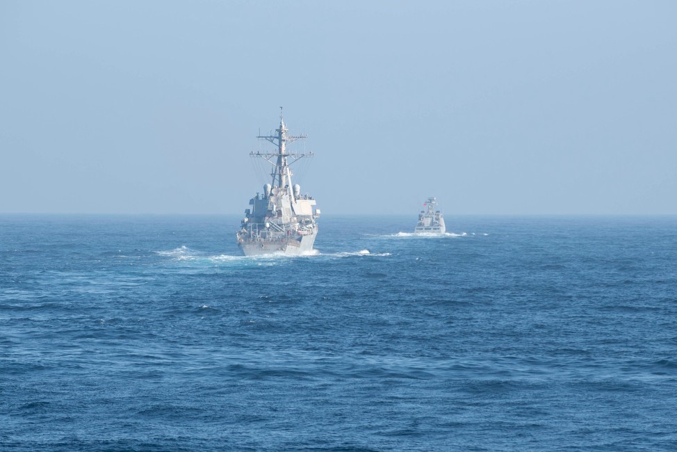 The Arleigh Burke-class destroyer USS Porter (DDG 78), left, the Royal Moroccan Navy frigate Tarik Ben Ziyad, center, and the Arleigh Burke-class destroyer USS Mitscher (DDG 57), sail in formation with the Nimitz-class aircraft carrier USS Dwight D. Eisenhower (CVN 69), March 3, 2021. The USS Dwight D. Eisenhower Carrier Strike Group is participating in Lightning Handshake, a bi-lateral maritime exercise between the U.S. and the Royal Moroccan Navy (RMN) and Royal Moroccan Air Force (RMAF). IKE is on a routine deployment in the U.S. Sixth Fleet area of operations in support of U.S. national interests and security in Europe and Africa.