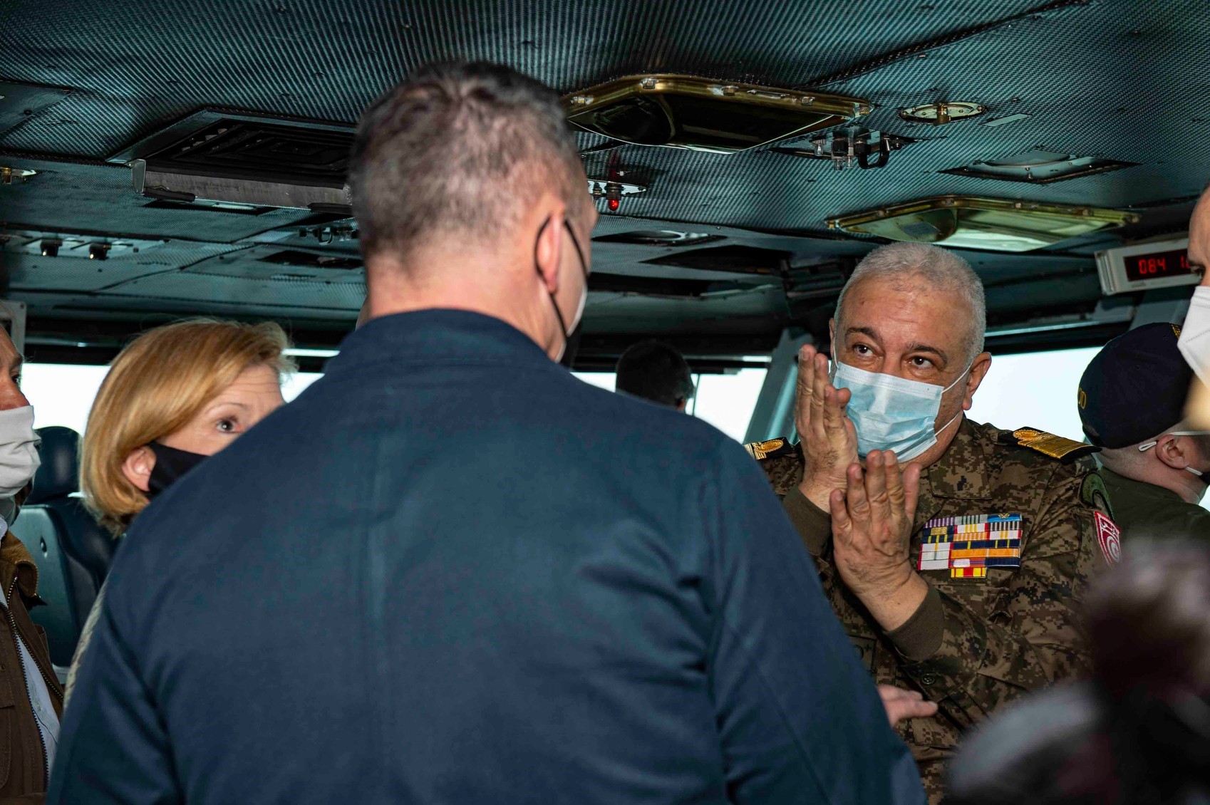 Rear Adm. Scott Robertson, Commander, Carrier Strike Group Two, left, speaks with Rear Adm. Adel Jehane, Tunisia Head of Navy, on the bridge of the Nimitz-class aircraft carrier USS Dwight D. Eisenhower (CVN 69), in the Mediterranean Sea, March 25, 2021. The IKE Carrier Strike Group is on a scheduled deployment in the U.S. Sixth Fleet area of operations in support of U.S. national interests and security in Europe and Africa.