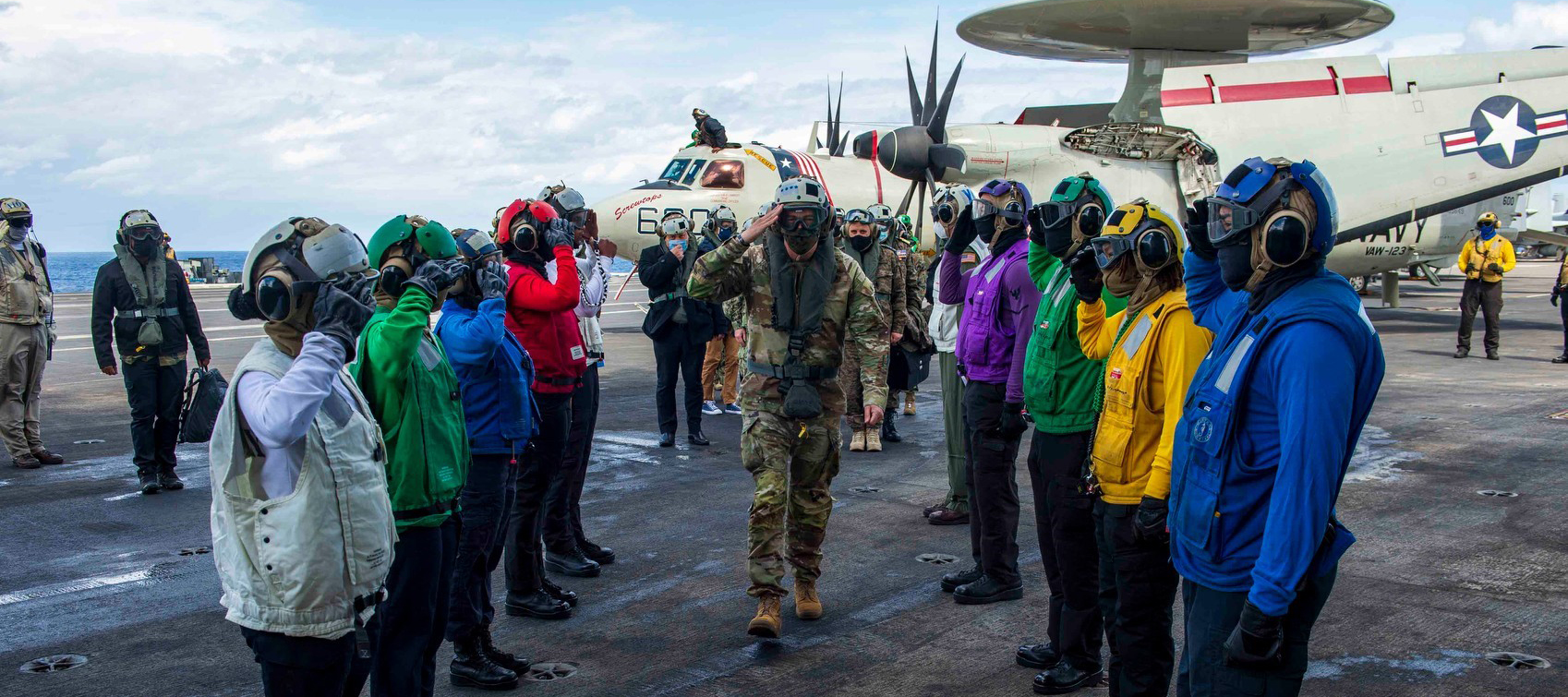 U.S. Army Gen. Stephen Townsend, commander, U.S. Africa Command, salutes Sailors on the flight deck as he arrives aboard the Nimitz-class aircraft carrier USS Dwight D. Eisenhower (CVN 69), in the Mediterranean Sea, March 25, 2021. The IKE Carrier Strike Group is on a scheduled deployment in the U.S. Sixth Fleet area of operations in support of U.S. national interests and security in Europe and Africa.