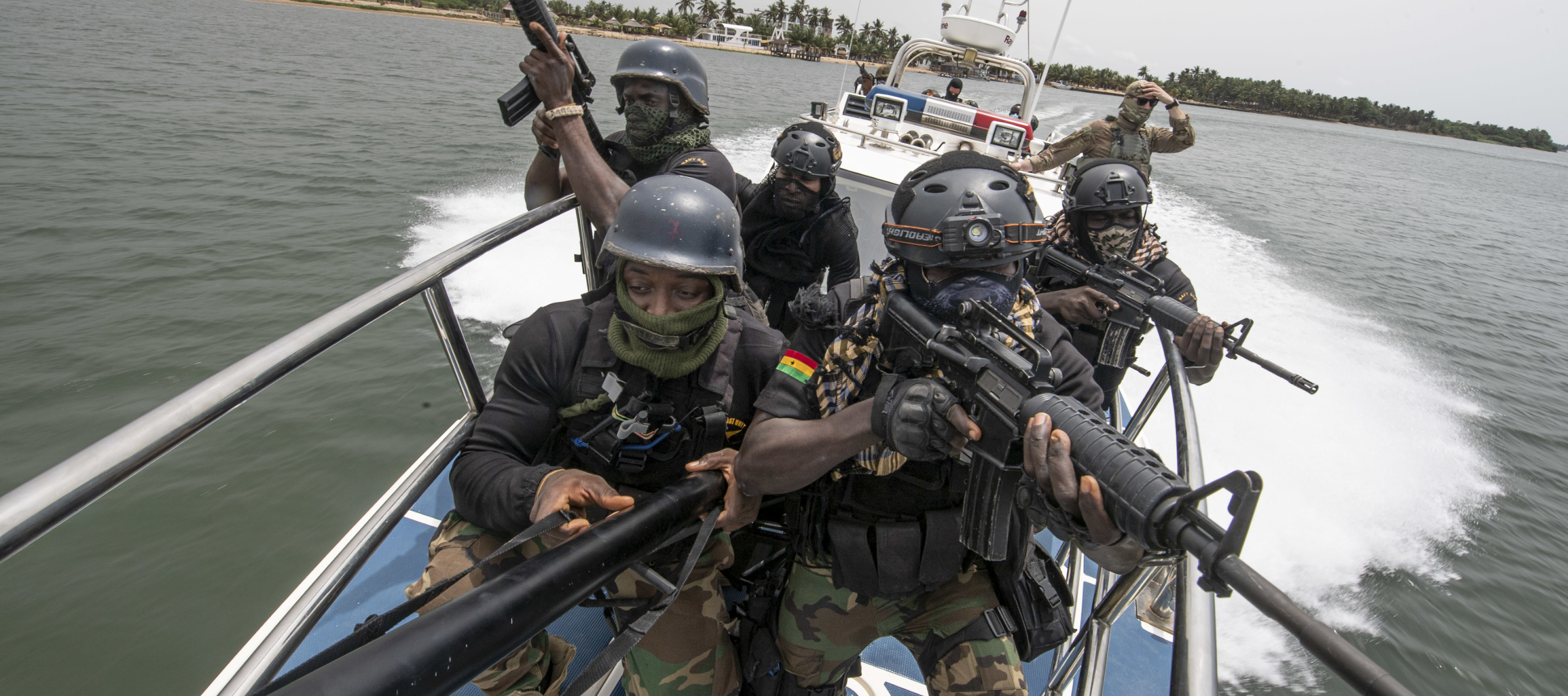 Service members from the Ghanaian special forces provide cover while approaching a vessel during a boarding exercise as part of Obangame Express 2021 on March 17, 2021. Obangame Express is an at-sea maritime exercise designed to improve cooperation among participating nations in order to increase maritime safety and security in the Gulf of Guinea and West Africa coastal regions.