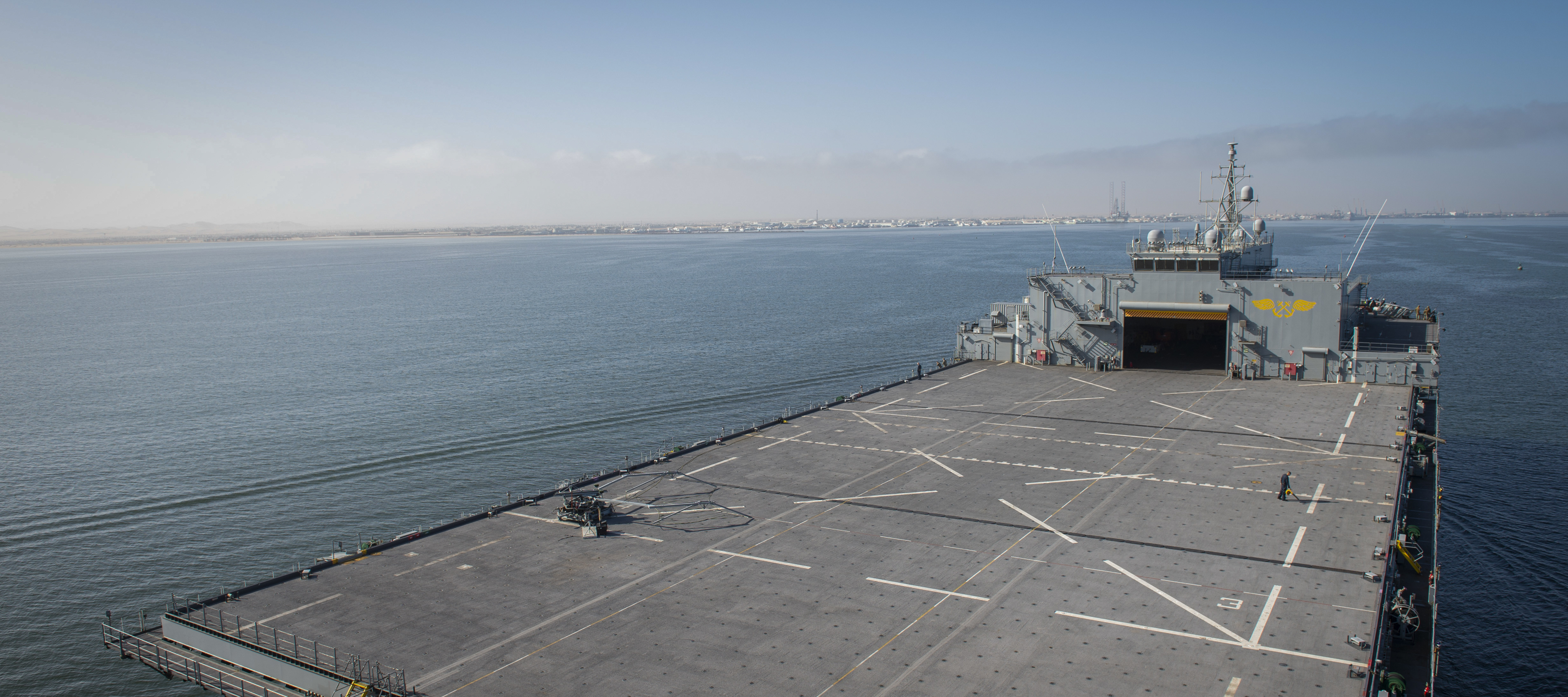 The Expeditionary Sea Base USS Hershel "Woody" Williams (ESB 4) approaches Walvis Bay, Namibia, Sept. 16, 2021. Hershel "Woody" Williams is on a scheduled deployment in the U.S. Sixth Fleet area of operations in support of U.S. national interests and security in Europe and Africa.