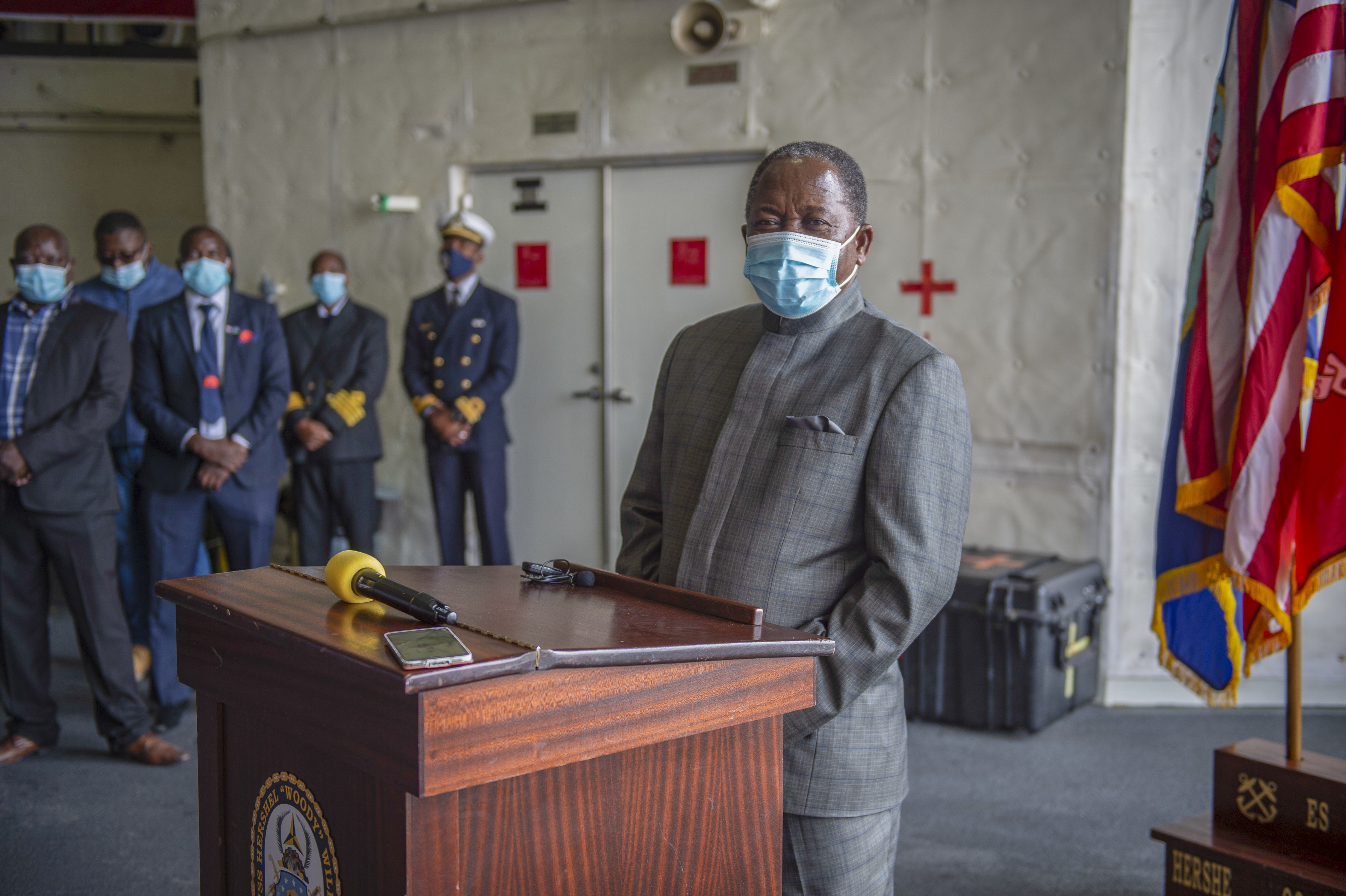Namibian Minister of Defense Hon. Frans Kapofi addresses a reception for Namibian Navy leadership and U.S. embassy personnel following a tour aboard the Expeditionary Sea Base USS Hershel "Woody" Williams (ESB 4) on Sept. 17, 2021. Hershel "Woody" Williams is on a scheduled deployment in the U.S. Sixth Fleet area of operations in support of U.S. national interests and security in Europe and Africa.