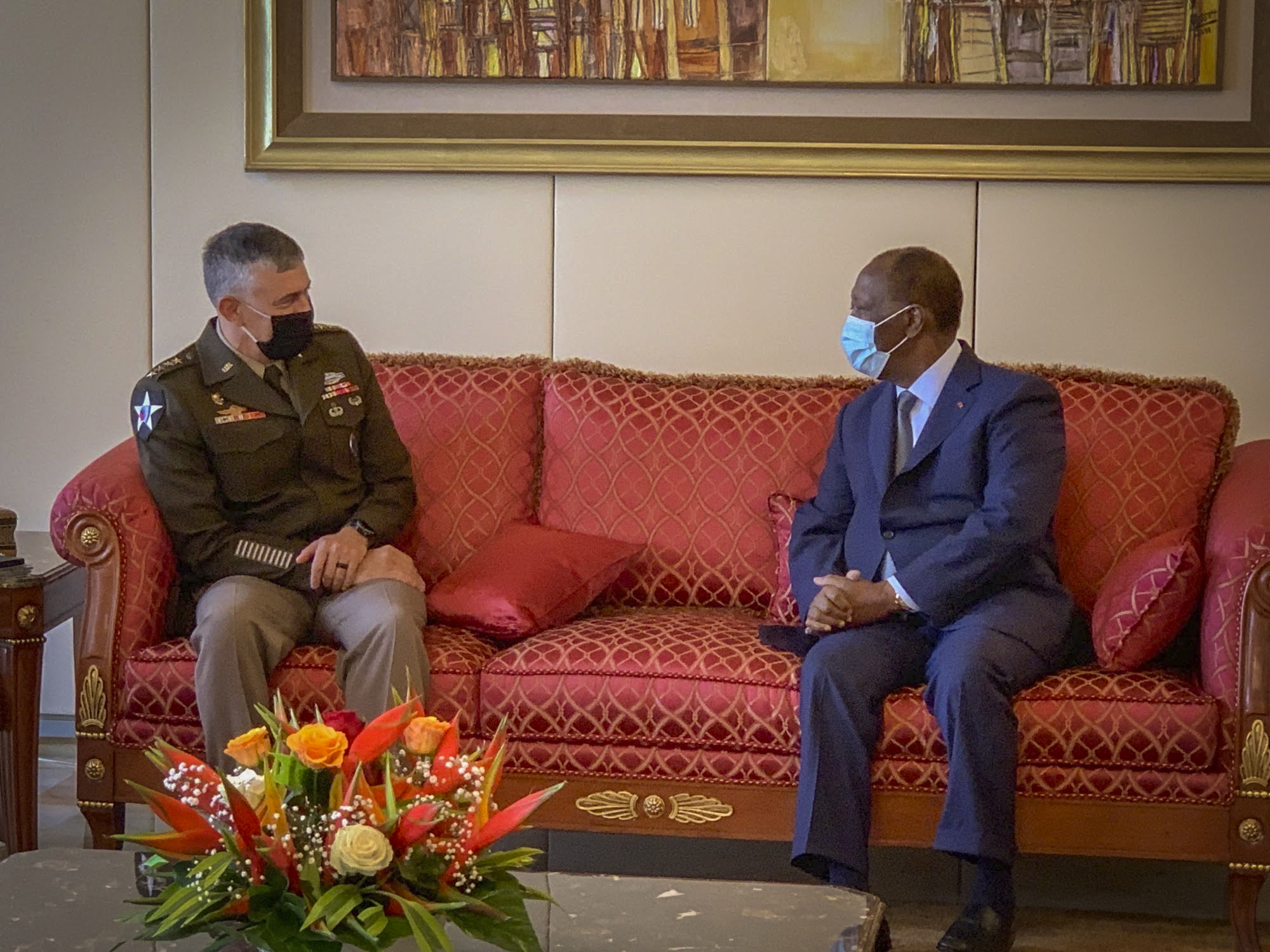 Gen. Stephen Townsend, commander, U.S. Africa Command, meets with Ivoirian President Alassane Ouattara to discuss security cooperation and training opportunities as part of a four-day trip to West Africa Sept. 21, 2021. “The United States views Côte d'Ivoire as an area in this region of economic growth and relative stability,” Townsend said. “I wanted to hear the views of your President on how we might help the states of this region enjoy the benefits we’re seeing here.”