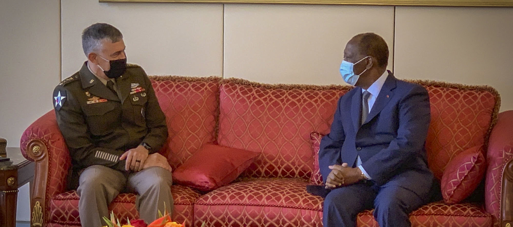 Gen. Stephen Townsend, commander, U.S. Africa Command, meets with Ivoirian President Alassane Ouattara to discuss security cooperation and training opportunities as part of a four-day trip to West Africa Sept. 21, 2021. “The United States views Côte d'Ivoire as an area in this region of economic growth and relative stability,” Townsend said. “I wanted to hear the views of your President on how we might help the states of this region enjoy the benefits we’re seeing here.”