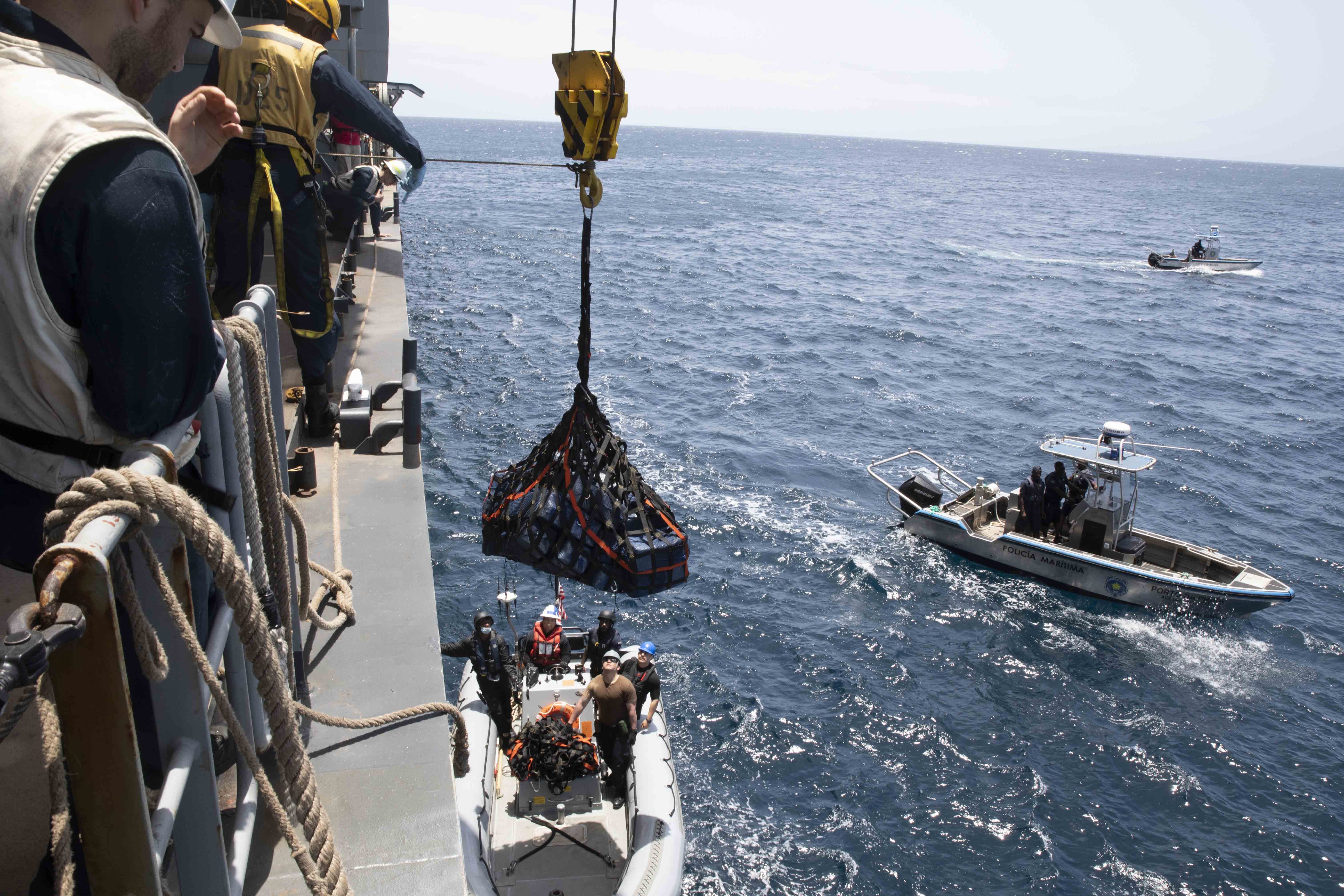 Sailors assigned to the Expeditionary Sea Base USS Hershel "Woody" Williams (ESB 4), lower seized contraband into a rigid-hull inflatable boat for transport to the Cabo Verdean authorities, April 6, 2022. Hershel "Woody" Williams is on a scheduled deployment in the U.S. Sixth Fleet area of operations in support of U.S. national interests and security in Europe and Africa.