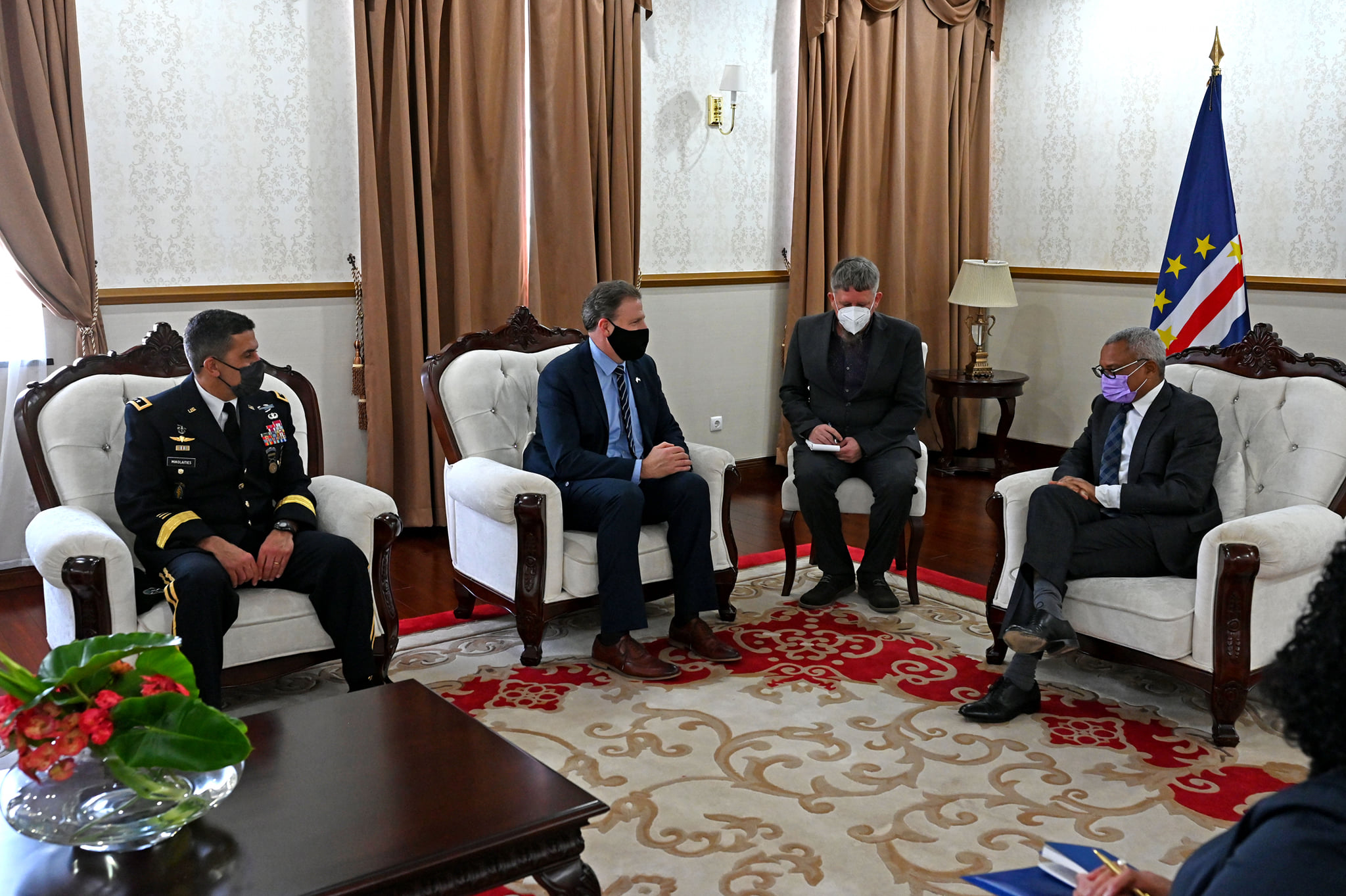 From left, New Hampshire Adjutant Gen. David Mikolaities, New Hampshire Gov. Chris Sununu, and interpreter Jeff Hessney meet with Cabo Verde President José Neves at the Presidential Palace on Feb. 3 in Praia, Cabo Verde. A New Hampshire delegation traveled to the West African republic for a signing ceremony to officially establish a state partnership with Cabo Verde under the National Guard Bureau’s State Partnership Program.