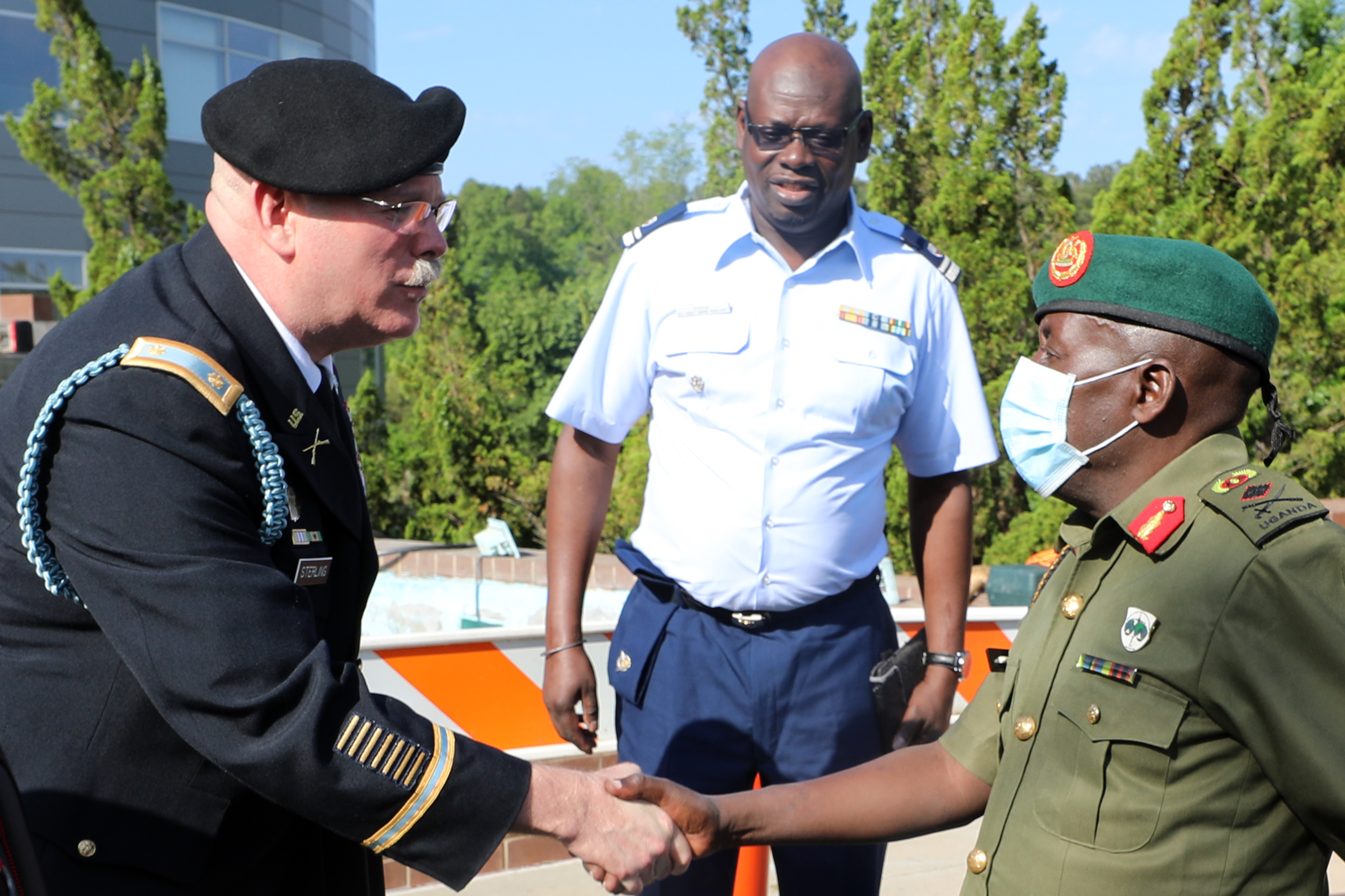 Maj. Mike Sterling, North Carolina National Guard State Partnership Director, greets Uganda People’s Defense Forces Brig. Gen. Godard Busingye at the African Military Law Forum Advisory Council at NCNG Joint Force Headquarters in Raleigh, North Carolina, April 26 - 28, 2022. The conference, created by the United States Africa Command, brought African military legal advisors from several nations including Botswana, one of the NCNG State Partnership Program peers, and Nigeria, Cameroon, Namibia, Burkina Faso, Uganda, Tunisia, Niger, Malawi, Burundi, and NCNG leaders including U.S. Army Brig. Gen. Jeffery Copeland, the NCNG Director of Joint Staff and retired Col. Rick Fay, NCNG Chief Counsel, to share their expertise in International, Operational, Administrative, and Civil law and to announce the formation of the Women’s Peace and Security component to the ongoing forum.
