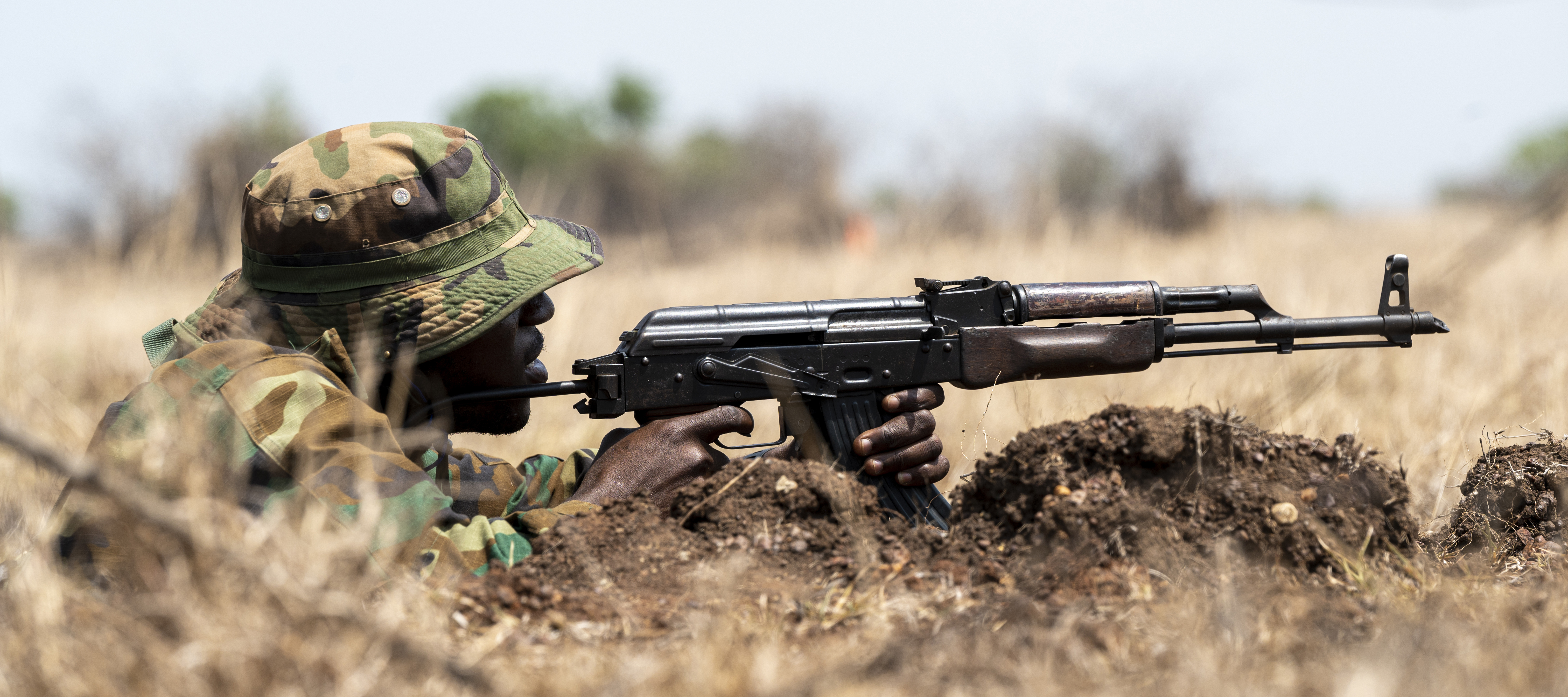 A Ghanaian soldier assigned to the 64th Infantry Regiment fires an AK-47 during a Joint Combined Exchange Training in Bundase, Ghana March 3, 2022. JCETs enhance U.S. relationships with partner nations by developing and maintaining critical military-to-military connections and improving joint and allied readiness and interoperability.
