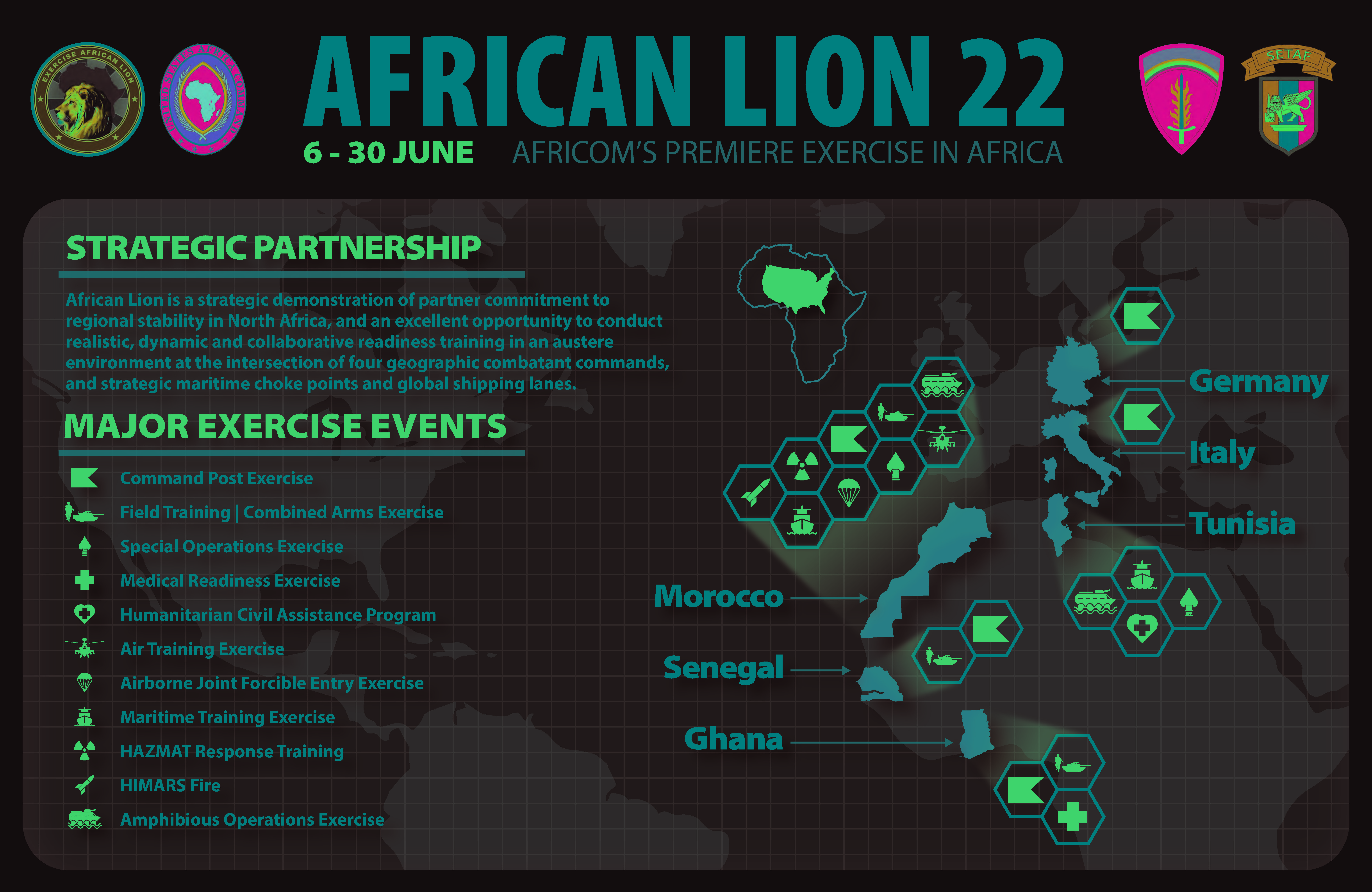 African Lion is U.S. Africa Command’s largest and premier annual exercise, involving more than 7,500 service members from June 6 - 30. AL22 features a Combined Joint Task Force Headquarters command post exercise; a combined arms live fire exercise; a maritime exercise; an air exercise with U.S. C-130J Super Hercules, KC-135 Stratotanker, and bomber aircraft; a joint forcible entry with paratroopers into a field training exercise; a chemical, biological, radiological, nuclear response exercise; and a humanitarian civic assistance program event.