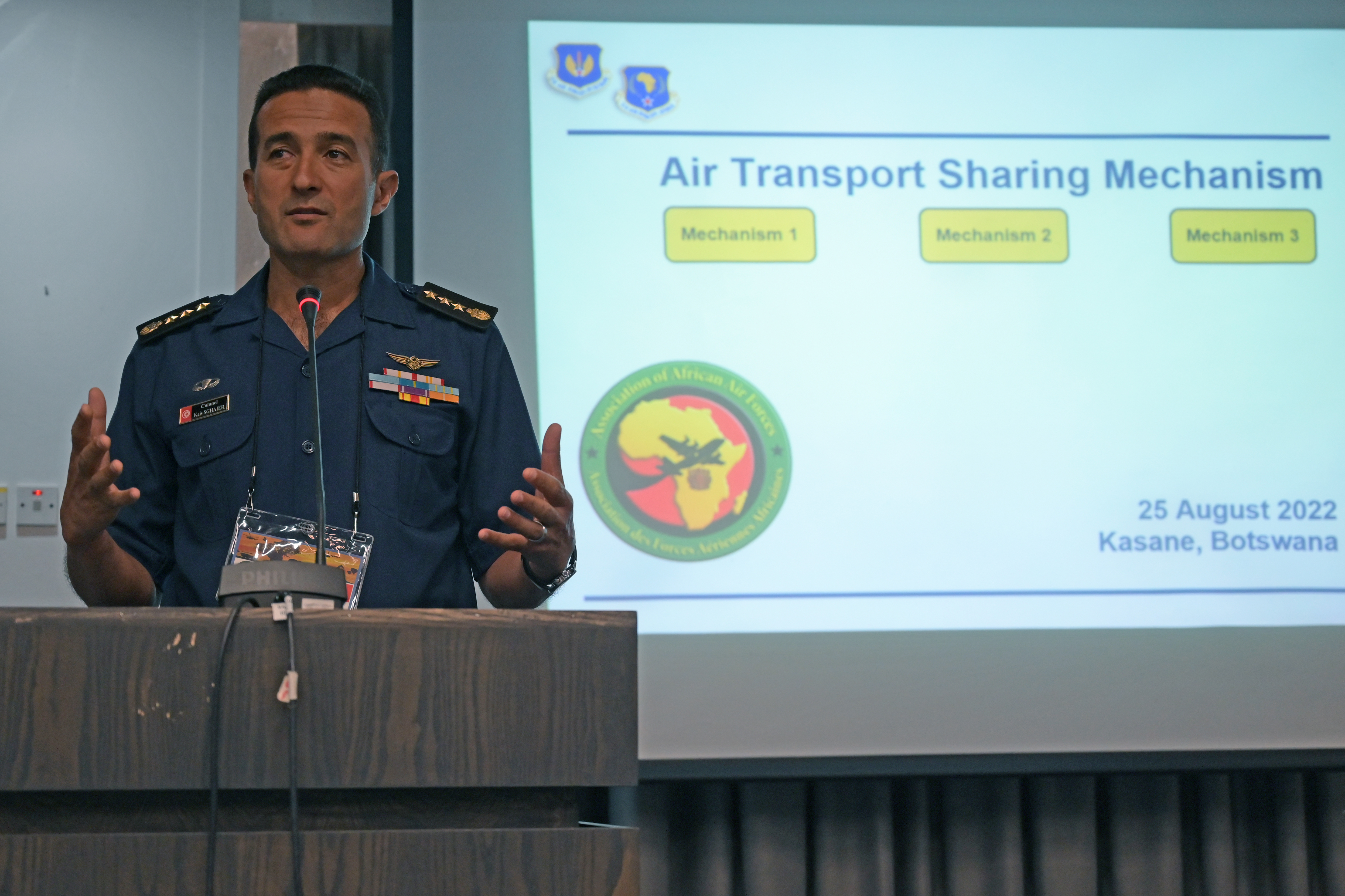 Tunisian air force Col. Kais Sghaier, 11th Air Unit commander, briefs liaison officers about the Air Transport Sharing Mechanism during the Association of African Air Forces’ 2022 LNO Working Group in Kasane, Botswana, Aug. 25, 2022. The ATSM goal is to enhance the African Union’s strategic lift capability.