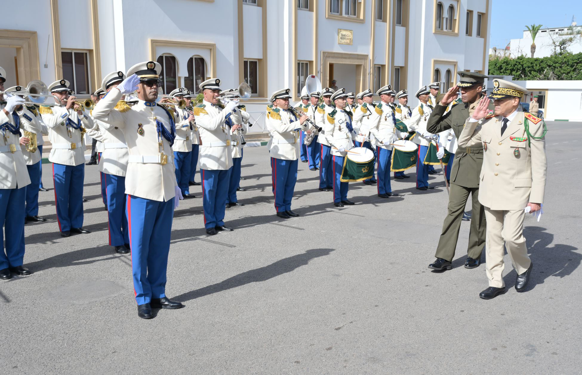 U.S. Marine Corps Gen. Michael Langley, commander, U.S. Africa Command, and General Belkhir El Farouk, inspector general of the Moroccan Armed Forces and commander of the Southern Zone, salute Moroccan service members during an Honor Guard pass and review in Rabat, Morocco, on Oct. 17, 2022. The visit to Morocco, followed by a stop in Tunisia, was Langley's third to Africa since taking command.