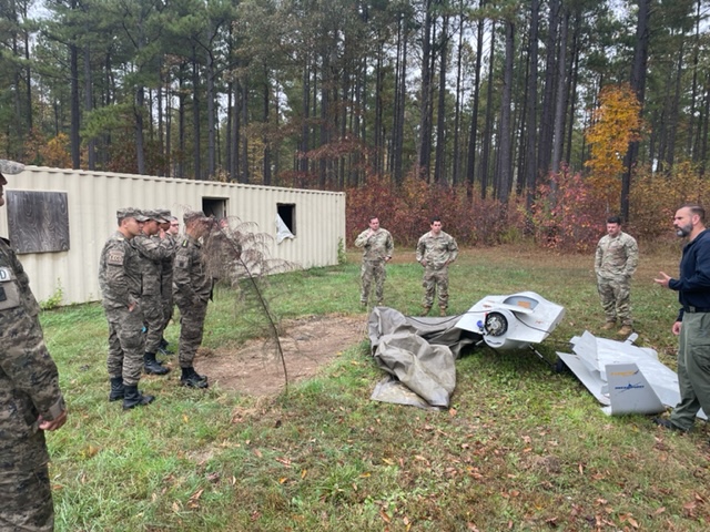 Counter-IED and explosive ordnance disposal experts discuss how malign actors use drones to deliver bombs on Oct. 26, 2022 at the CPT Jason T. McMahon training complex on Fort A.P. Hill. Six EOD and C-IED experts from Tunisia Armed Forces visited U.S. Army Training and Doctrine Command's EOD Munitions and EOD Training Department Oct. 25-26. Organized by U.S. Army Southern European Task Force, Africa's C-IED Branch, the Tunisians observed and discussed how the U.S. Army trains EOD and C-IED Soldiers.