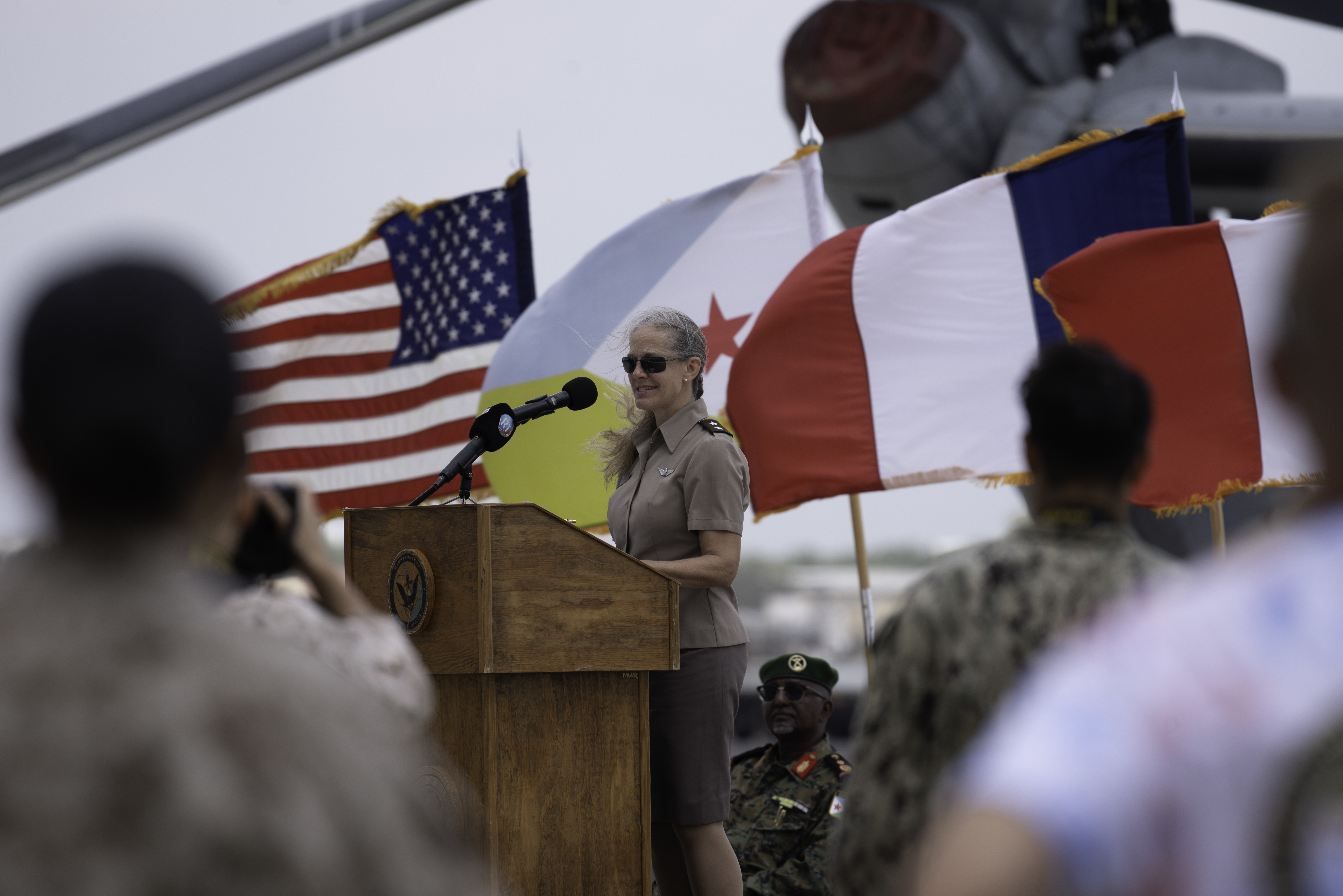 U.S. Army Maj. Gen. Jami Shawley, commanding general of Combined Joint Task Force - Horn of Africa, delivers remarks to guests of the Partner Appreciation Day 2022 event at Camp Lemonnier, Djibouti, on Nov. 10, 2022. The event celebrated the 20th anniversary of the arrival of U.S. service members in Djibouti after the terrorist attacks of 9/11.