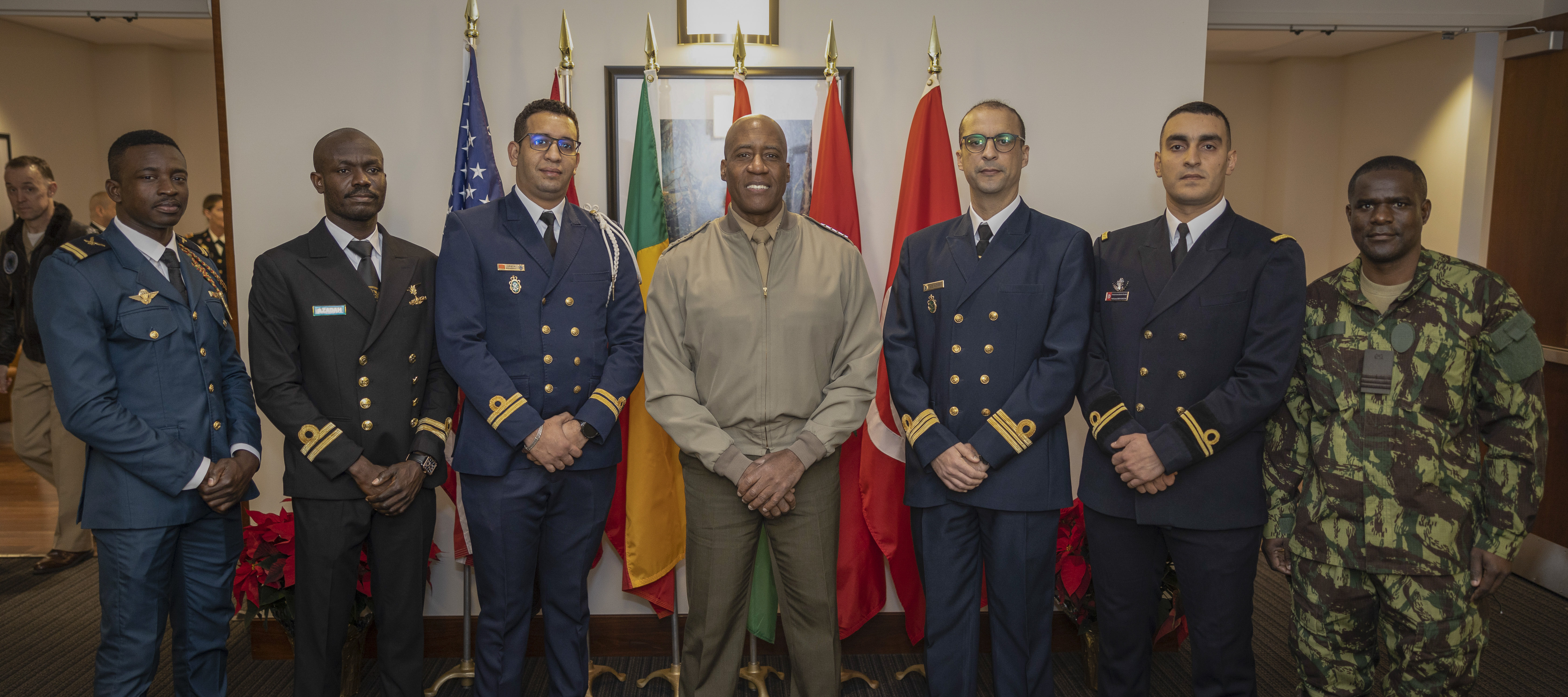 Gen. Michael Langley, commander, U.S. Africa Command, meets with International Military Education and Training partners during a speaking engagement at MCB Quantico, Va., Dec. 12, 2022. Gen. Langley met with six IMET students during the engagement and highlighted the relationship between the United States and allied nations for a collective effort in promoting regional security and stability in Africa.