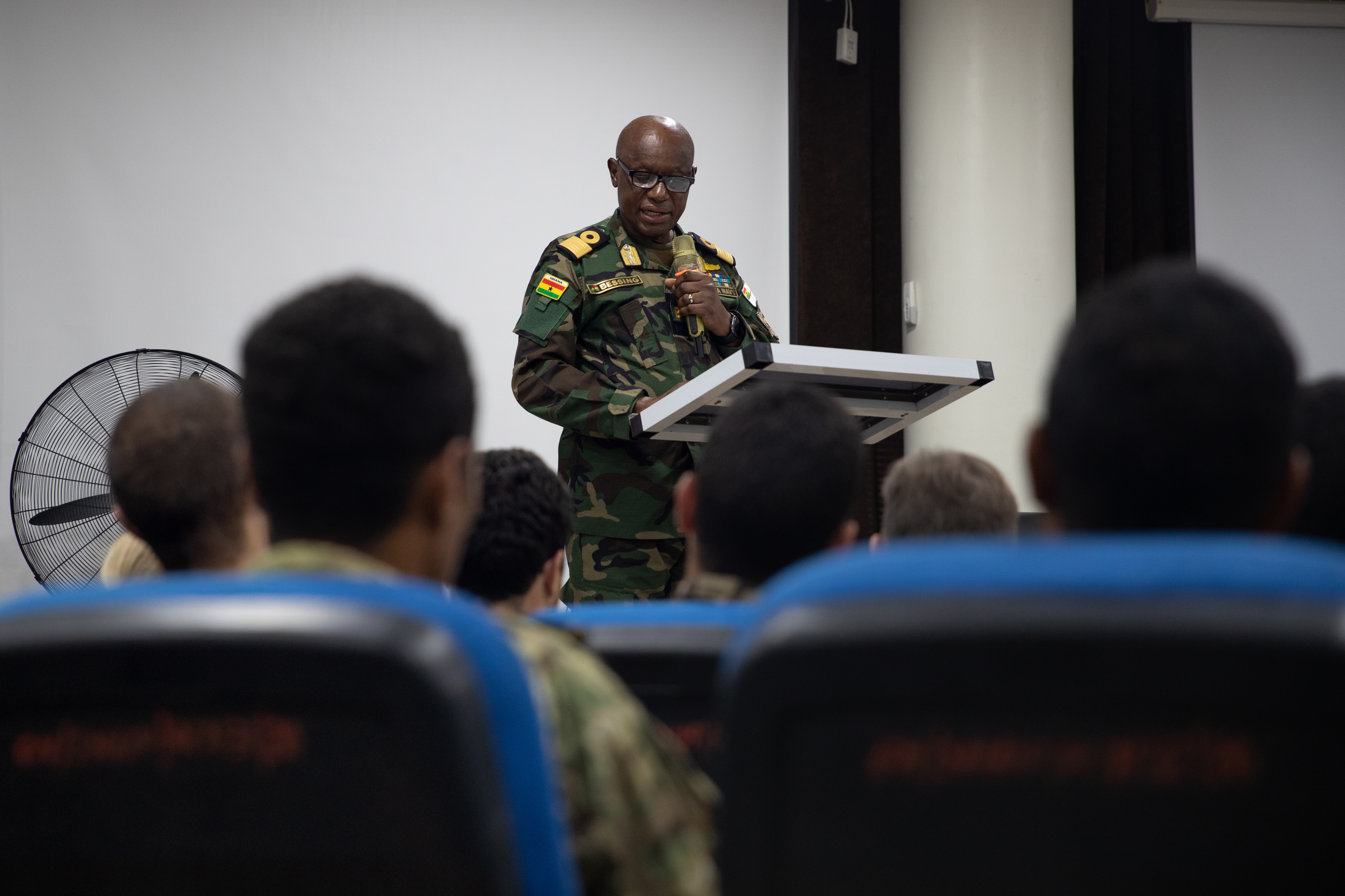 Commodore Godwin Livinus Bessing, Commanding Officer of Naval Training Command (NAVTRAC), provides keynote remarks during the opening ceremony of Flintlock’s maritime portion in Volta, Ghana, March 7, 2023. Flintlock is U.S. Africa Command’s premier and largest annual special operations exercise that strengthens key partner nations throughout Africa, in partnership with other international special operations forces. (U.S. Army photo by Staff Sgt. Charles Brock)