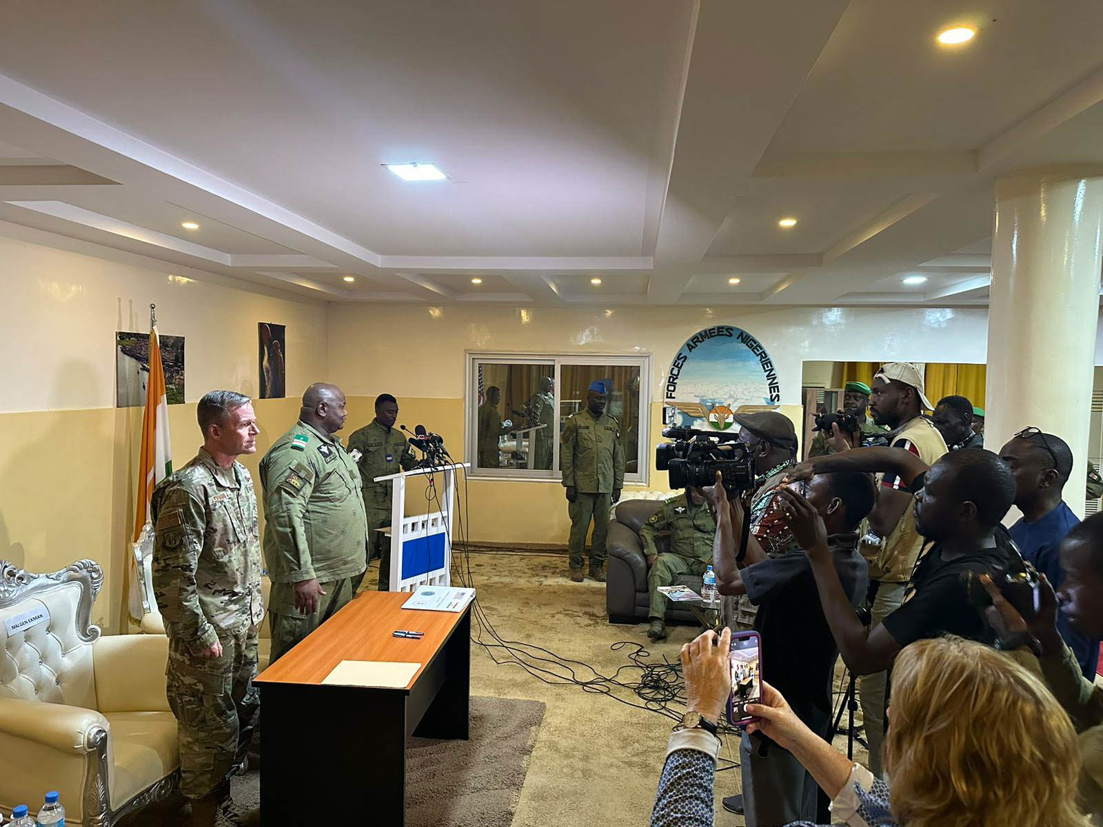 Maj. Gen. Kenneth Ekman, U.S. Africa Command Director for Strategy, Engagement and Programs (J5) and Colonel Major Mamane Sani Kiaou, Nigerien Chief of Army Staff, address the media during a ceremony marking the official turnover of the U.S. compound on Air Base 101 in Niamey. This Nigerien base has housed U.S. personnel and assets to help counter violent extremist organizations in the region. With the closure of the U.S. compound on Air Base 101, U.S. forces will now focus on completing the withdrawal from Air Base 201 in Agadez.