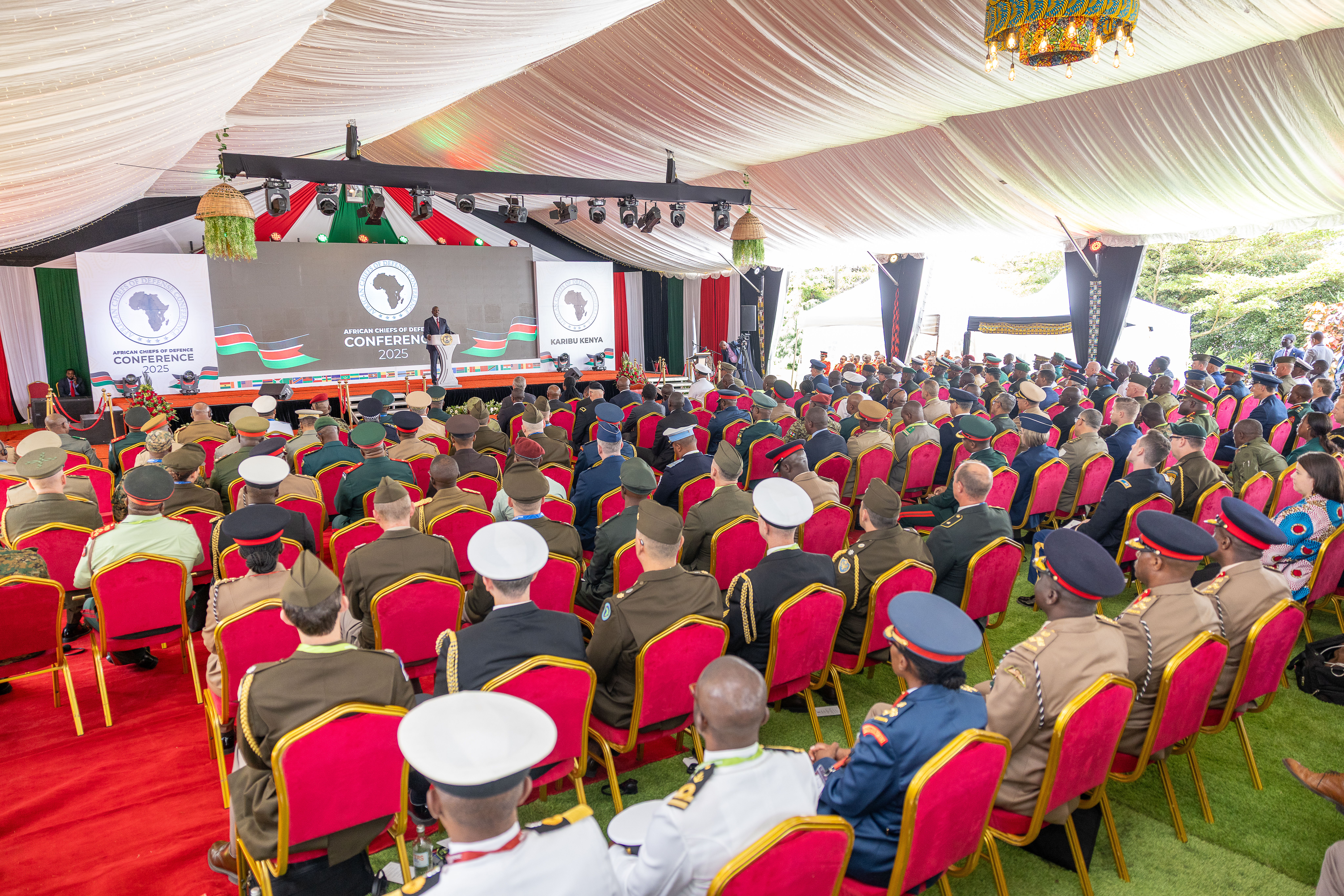 His Excellency Dr. William Samoei Ruto, C.G.H., President of the Republic of Kenya and Commander-in-Chief of the Defence Forces delivers remarks during the opening ceremony of the 2025 African Chiefs of Defense conference, May 28, 2025. The 2025 African Chiefs of Defense Conference (ACHOD25) brings together Chiefs of Defense from 37 African countries, U.S. Naval Forces Africa, Special Operations Command Africa, U.S Air Forces Africa, and U.S. Army Africa in Nairobi, Kenya. ACHOD25 provides an opportunity for senior military officials from across Africa to discuss topics such as countering transnational threats, strengthening U.S. and African partnerships, as well as fostering expertise-sharing and alliances. ACHOD25 advances regional stability and collective defense, supporting U.S. national security by promoting cost-effective, African-led solutions that minimize direct U.S. military involvement while enhancing global stability. (Courtesy upload for Elly Okware)