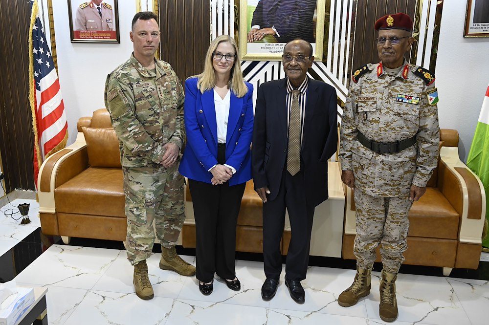 (Sept. 1, 2025) — U.S. Air Force Gen. Dagvin Anderson, commander of U.S. Africa Command (AFRICOM), poses for a photo with U.S. Ambassador Cynthia Kierscht, Djiboutian Minister of Defense Hassan Omar Mohamed, and Djiboutian Chief of Defense Gen. Zakaria Cheikh Ibrahim during a meeting in Djibouti City. The engagement marked Anderson’s first official meeting with Djiboutian and U.S. leadership on the continent since assuming command of AFRICOM.