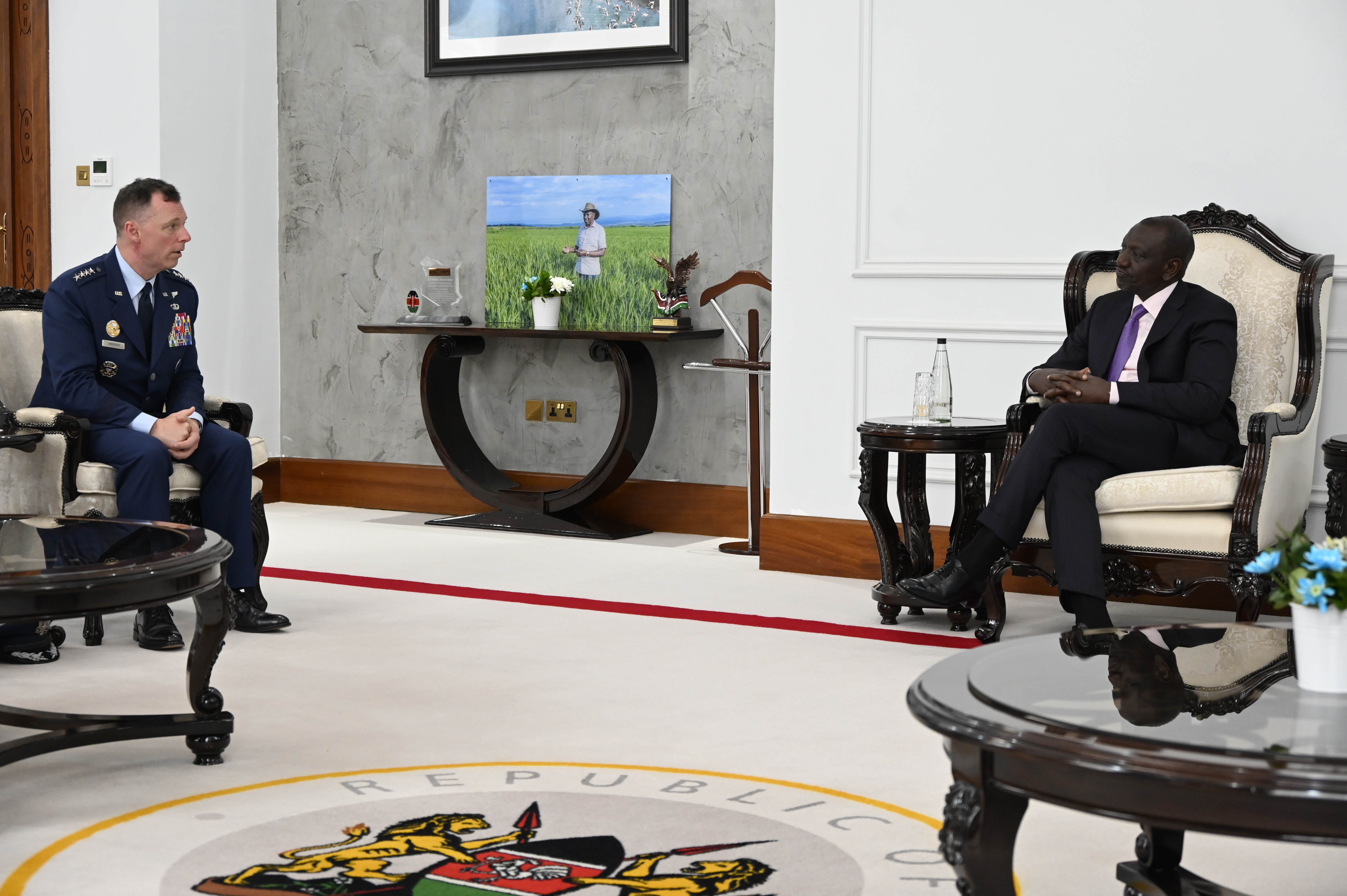 U.S. Air Force Gen. Dagvin Anderson, commander of U.S. Africa Command (AFRICOM), meets with Kenyan President William Ruto at the State House in Nairobi. The meeting took place during Anderson’s first trip to Kenya as the new AFRICOM commander.