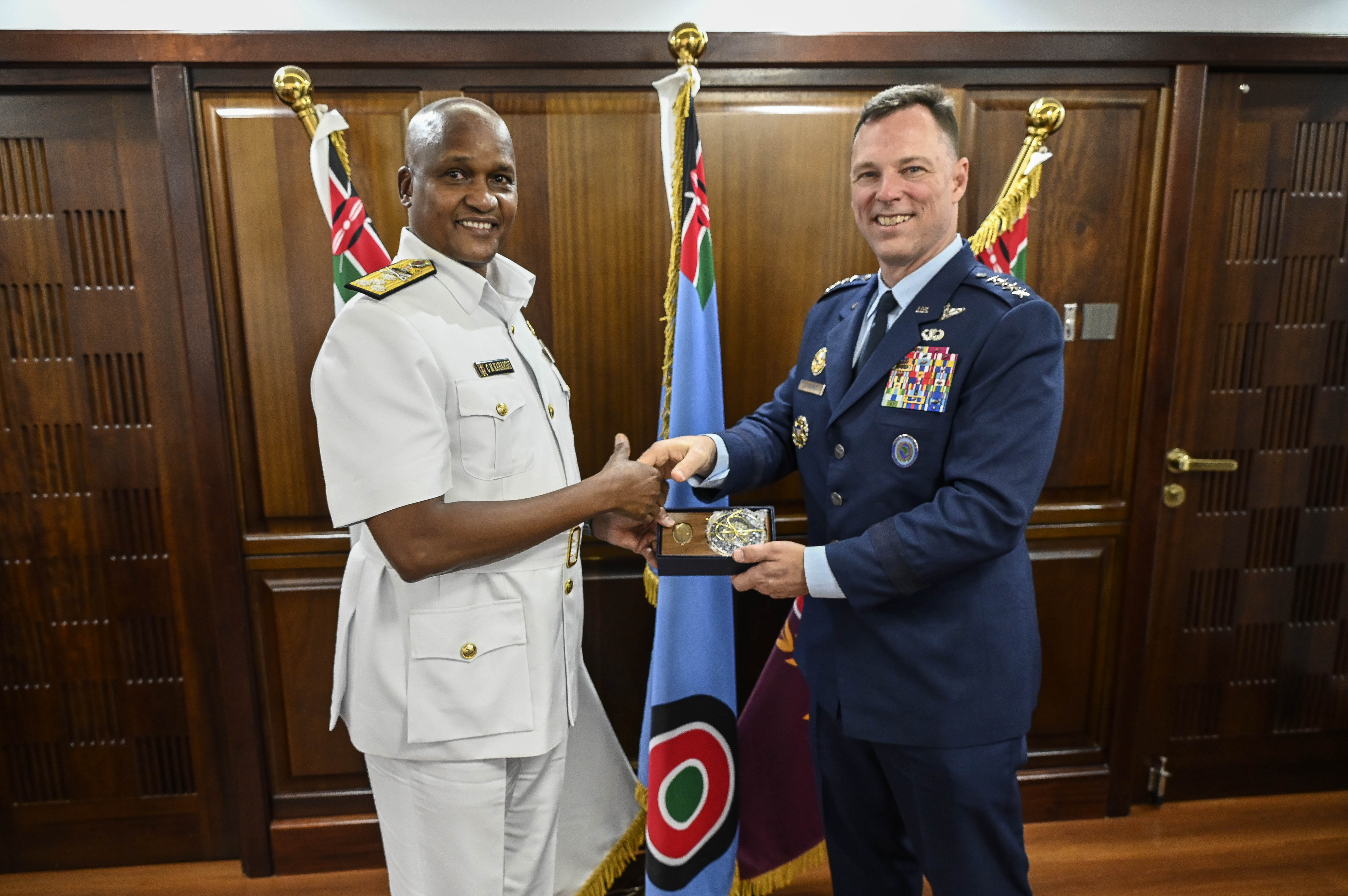 U.S. Air Force Gen. Dagvin Anderson, commander of U.S. Africa Command (AFRICOM), presents a gift to Gen. Charles Muriu Kahariri, Chief of the Kenya Defence Forces, during an office call at the Kenyan Ministry of Defense Headquarters. The meeting highlighted the strong U.S.–Kenya defense partnership and marked Anderson’s first visit to Kenya since assuming command of AFRICOM.