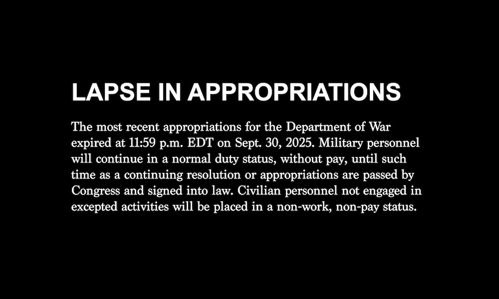 The most recent appropriations for the Department of War expired at 11:59 p.m. EDT on Sept. 30, 2025. Military personnel will continue in a normal duty status, without pay, until such time as a continuing resolution or appropriations are passed by Congress and signed into law. Civilian personnel not engaged in excepted activities will be placed in a non-work, non-pay status.