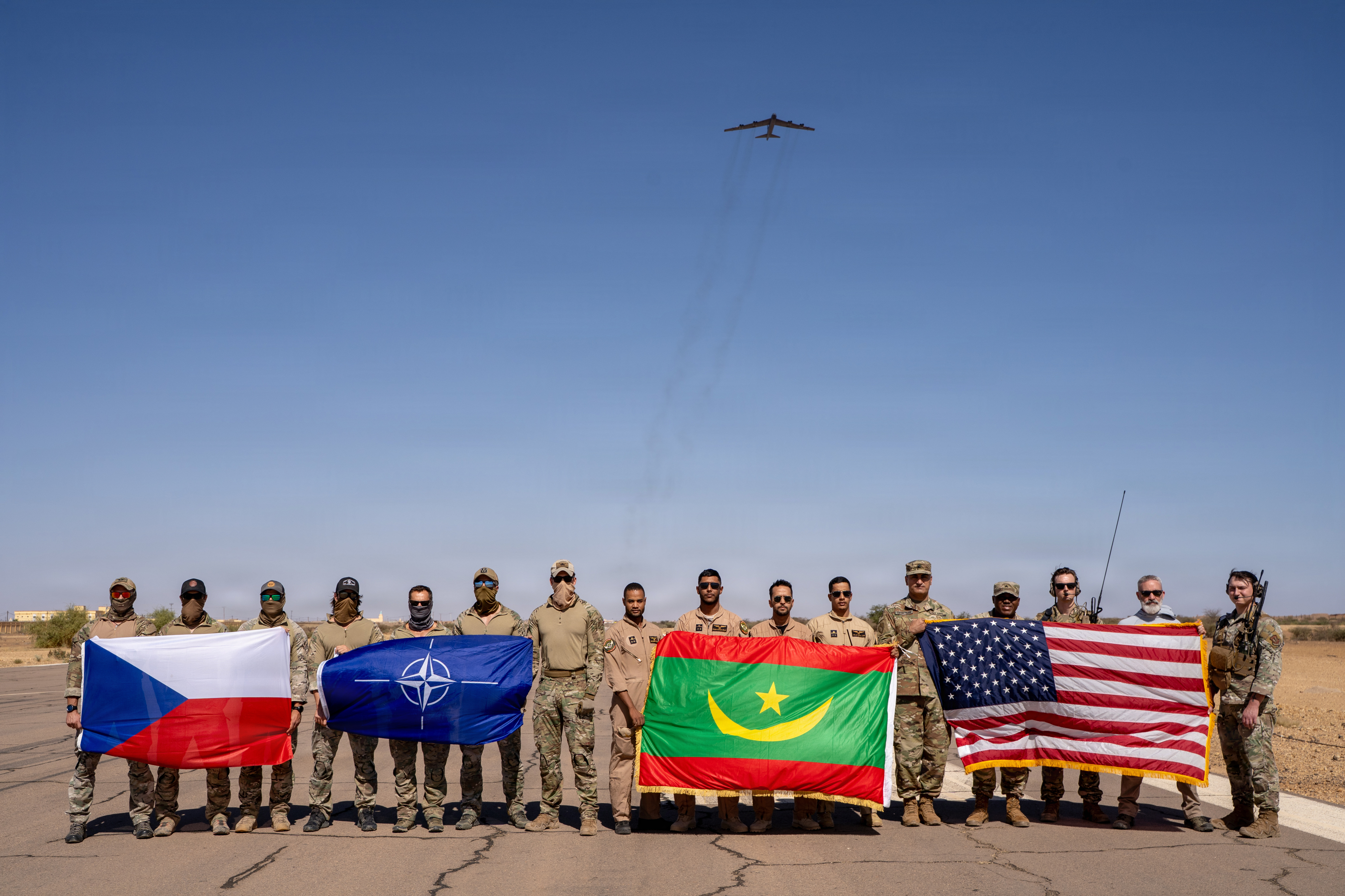 A U.S. Air Force B-52H Stratofortress assigned to the 96th Expeditionary Bomb Squadron is flown over Czech Special Forces, Mauritanian pilots, and U.S. Forces as part of Bomber Task Force 26-1 and a close air support training event in Atar, Mauritania, November 19, 2025. (U.S. Air Force photo by Tech Sgt. Katelynn Moeller)