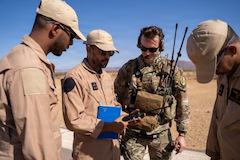 U.S. Air Force Staff Sergeant Justin Cole, a Joint Terminal Attack Controller assigned to the 2nd Air Support Operations Squadron, assists pilots from the Mauritanian Air Force in making 9-Line close air support training calls to a B-52H Stratofortress assigned to the 96th Expeditionary Bomb Squadron in Atar, Mauritania, November 19, 2025. (U.S. Air Force photo by Tech Sgt. Katelynn Moeller)