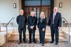 Archbishop Timothy P. Broglio, Archbishop of the Archdiocese for the U.S. Military Services, U.S. Ambassador Cynthia Kierscht, U.S. Ambassador to Djibouti, Army Maj. Christopher Zeigler, director of religious affairs, Joint Task Force - Horn of Africa, and U.S. Navy Lt. Cmdr. Father Samuel Schneider, Camp Lemonnier Navy chaplain, confer during the Archbishop’s pastoral visit to Djibouti, Dec. 17, 2025. Throughout the week, the Archbishop engaged with U.S. and Djiboutian religious, diplomatic and military leaders underscoring religious outreach as a complementary effort within broader U.S. initiatives to strengthen partnerships and security cooperation in East Africa. (U.S. Army photo by Sgt. 1st Class Kenneth Tucceri)