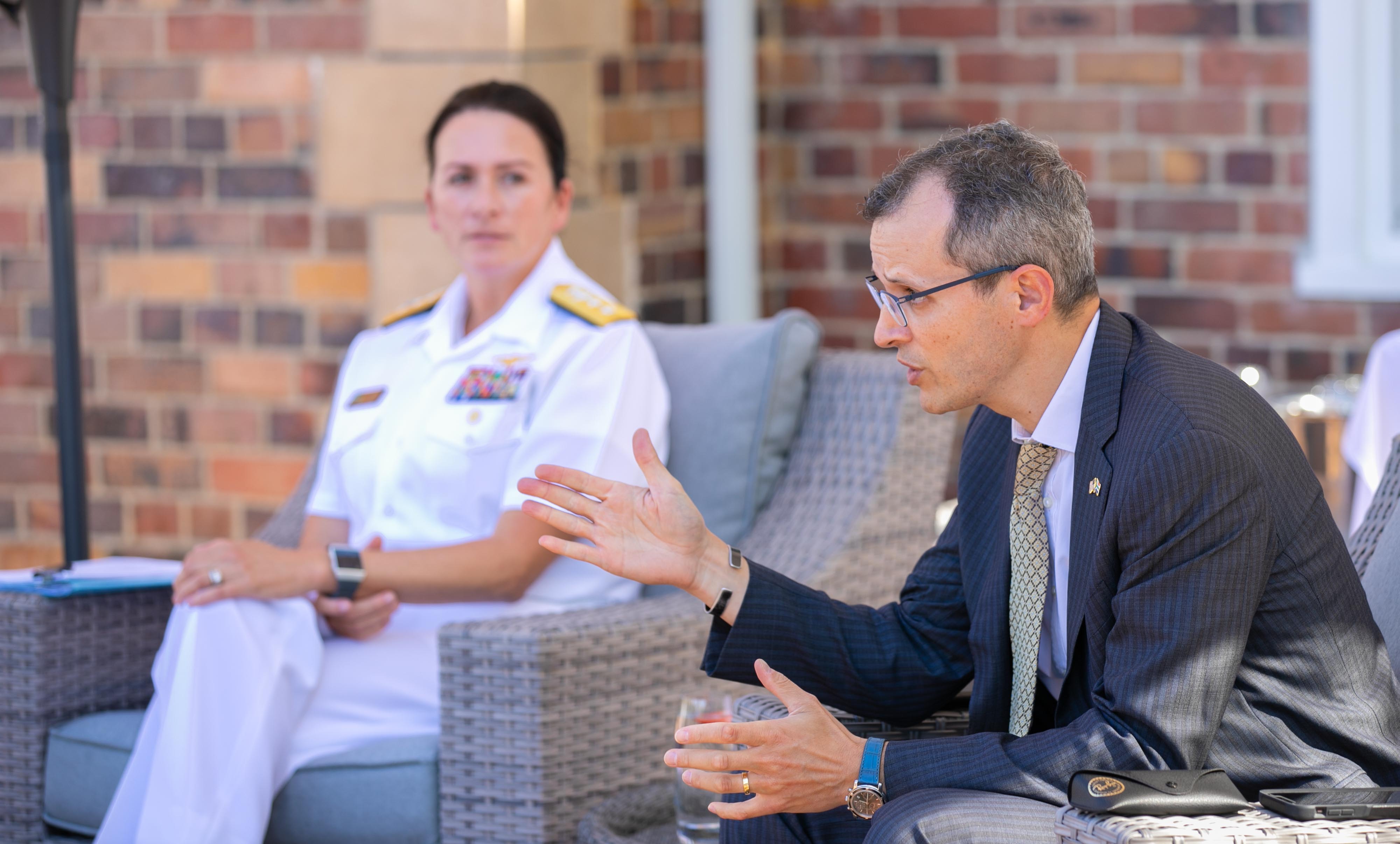 From left to right, Ann Castiglione-Cataldo, director, International Affairs and Foreign Policy Advisor to U.S. Coast Guard, Todd Haskel, Chargé d' affaires, U.S. Embassy South Africa, and Rear Adm. Nancy Lacore, chief of staff, U.S. Naval Forces Europe and Africa speak to a group during a Women, Peace, and Security event in Cape Town, South Africa , Oct. 6, 2021. U.S. Naval Forces Europe and Africa, headquartered in Naples, Italy, conducts the full spectrum of joint and naval operations, often in concert with allied and interagency partners, in order to advance U.S. national interests and security and stability in Europe and Africa.