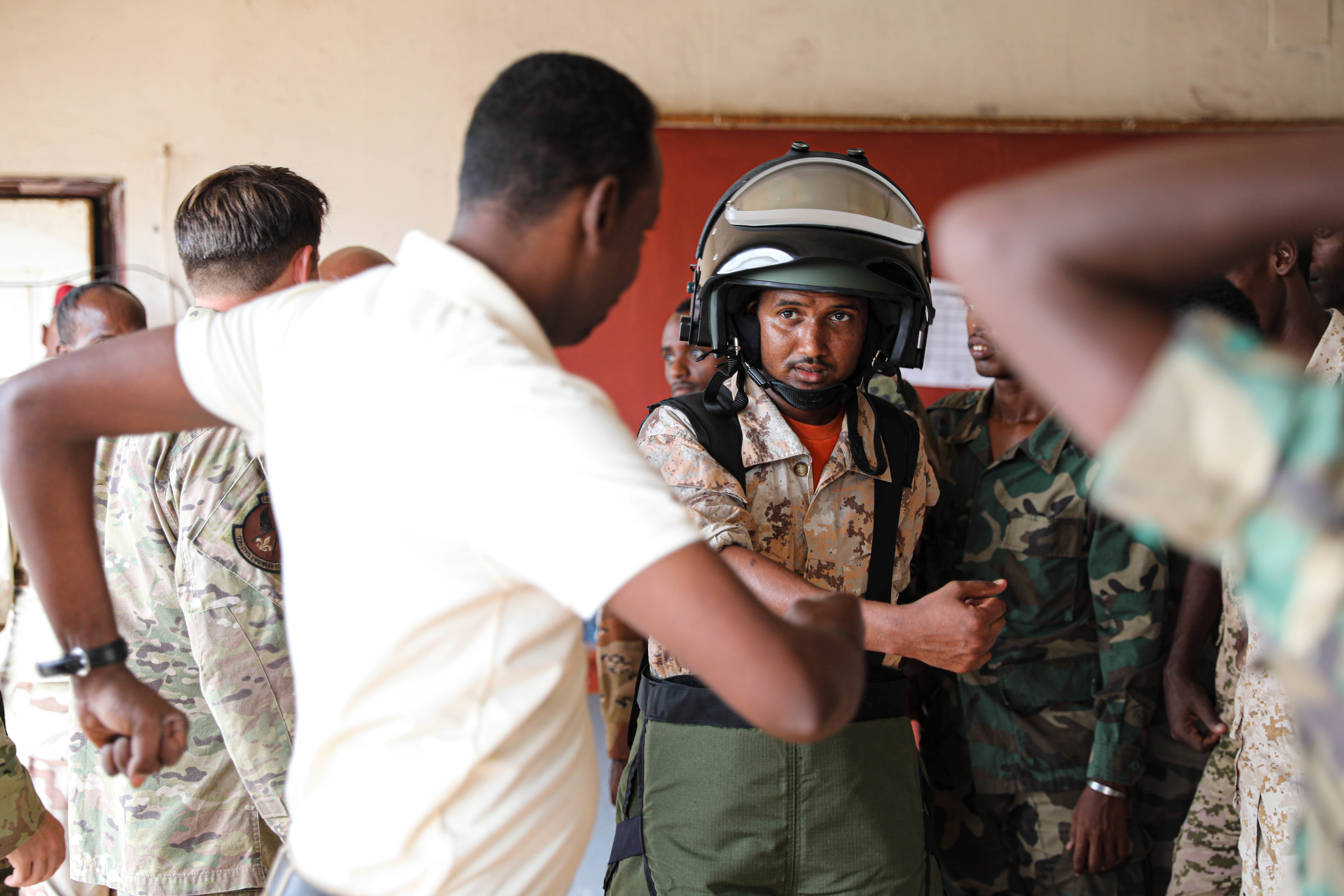 Service members from the Kentucky National Guard interact with soldiers from the Djiboutian Demining Company during a practical filed exercise in Djibouti City, Djibouti, on Aug. 24, 2021. The demining unit was established in 2001 to ensure that Djibouti could become mine-free after years of civil war throughout the 1990s, a goal that was achieved in 2003. Eighteen years later, mines remain a threat in the surrounding region.