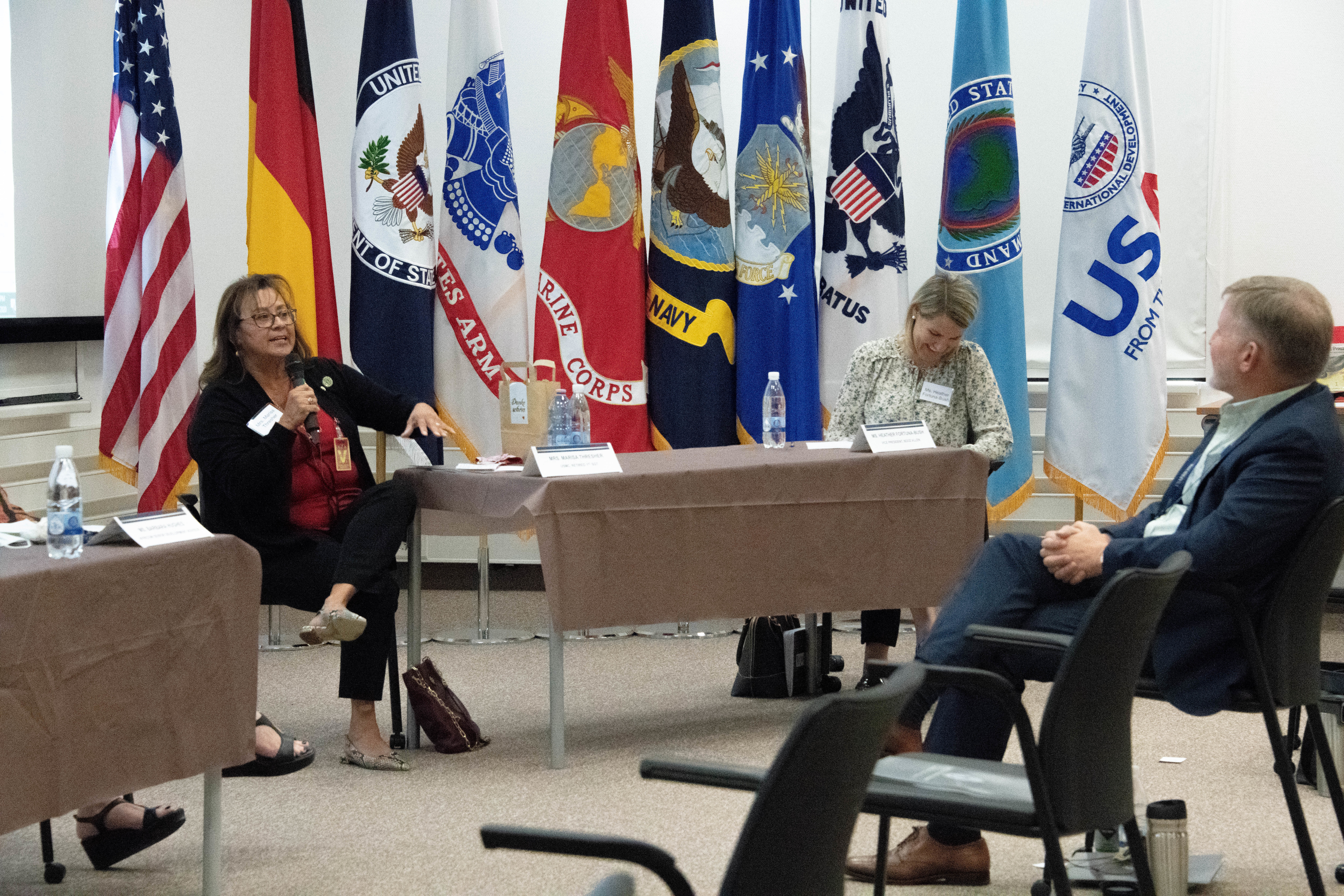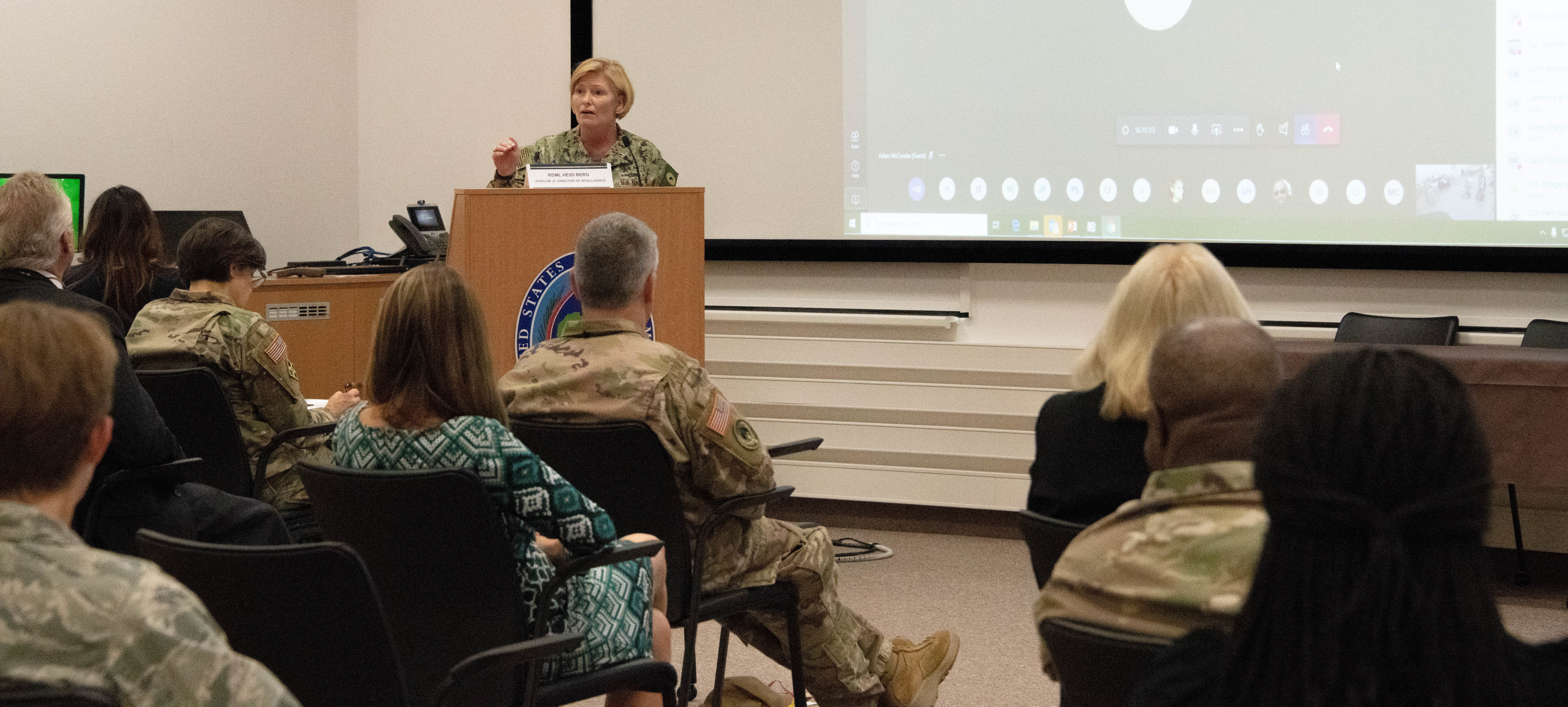 STUTTGART, Germany—Col. Jeffrey M, Schroeder (left), director, command control, communications, and computer systems, and Col. Gretchen Nunez (right), director, joint cyber center, U.S. Africa Command, listen to their African nation counterparts as they discuss cybersecurity during COVID-19, U.S. African Stuttgart, Germany, August 5, 2020. The two-day course included African partners from Uganda, Botswana, Ghana, Kenya, and Morocco. (Photo by U.S. Army Staff Sgt. Flor Gonzalez, Public Affairs, U.S. Africa Command)