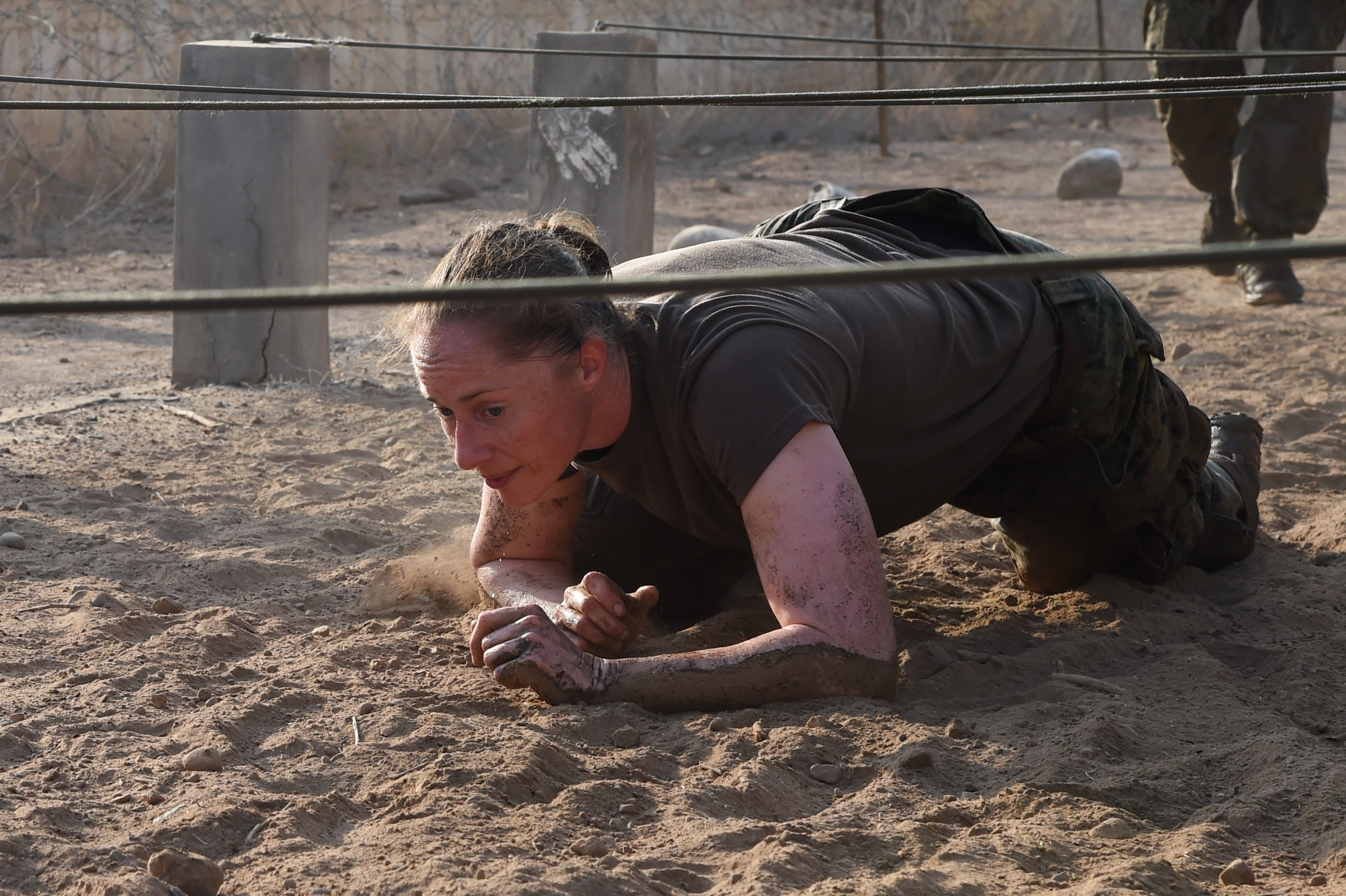 U.S. Navy Lt. Cmdr. Brighid Clark, Combined Joint Task Force-Horn of Africa Civil Affairs, navigates a low-crawl obstacle during a mud run hosted by the French military, Nov. 6, 2016, in Djibouti, Djibouti. The event allowed coalition forces from French, Japanese, and American teams to interact and build camaraderie while navigating a five kilometer course. The French 5th Marine Regiment team took first place. (U.S. Air Force photo by Staff Sgt. Penny Snoozy)