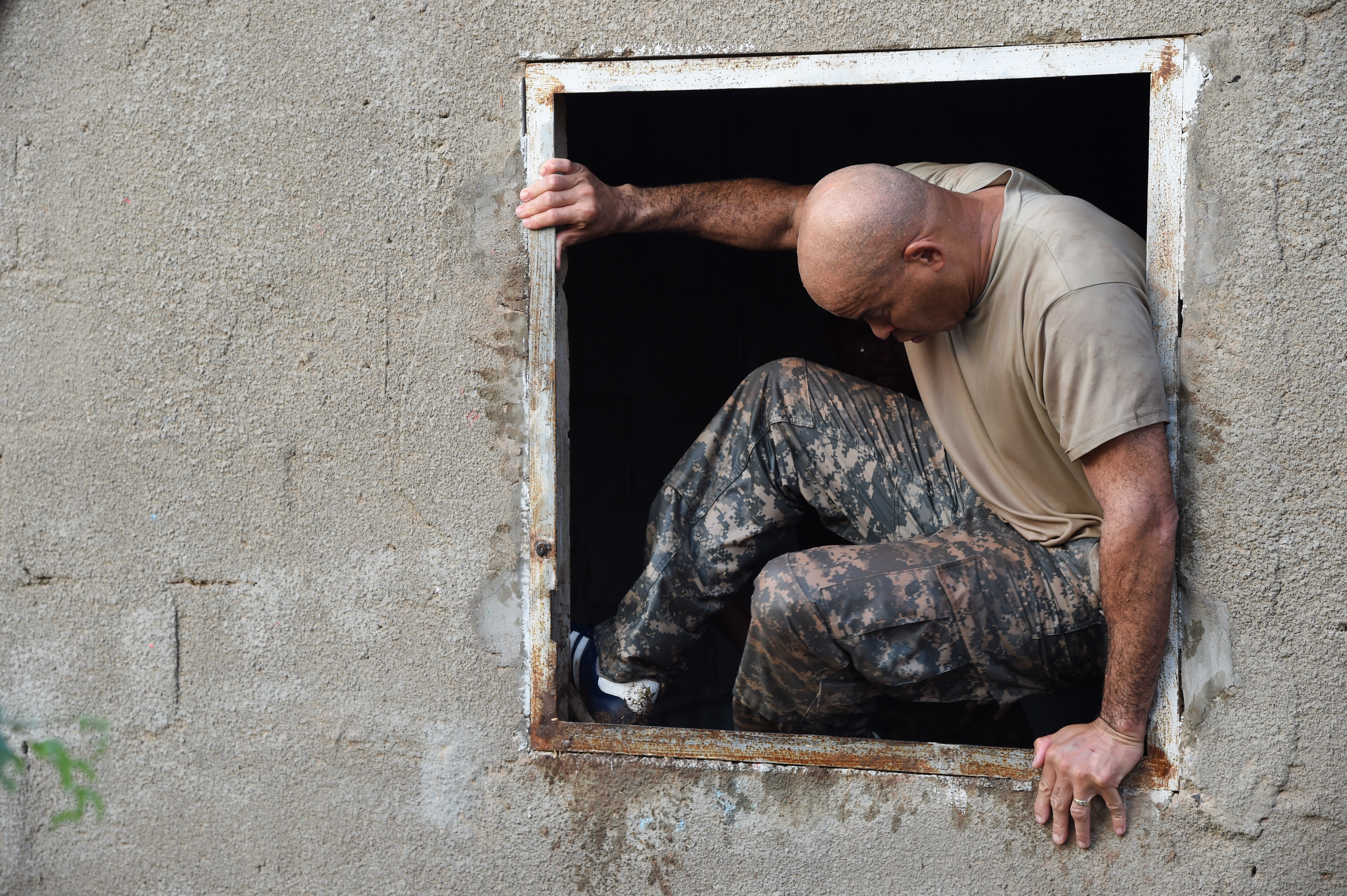 U.S. Army Sgt. Maj. Rodger Campbell, Combined Joint Task Force-Horn of Africa Civil Affairs, jumps through a window obstacle during a mud run hosted by the French military, Nov. 6, 2016, in Djibouti, Djibouti. The event allowed coalition forces from French, Japanese, and American teams to interact and build camaraderie while navigating a five kilometer course. The French 5th Marine Regiment team took first place. (U.S. Air Force photo by Staff Sgt. Penny Snoozy)