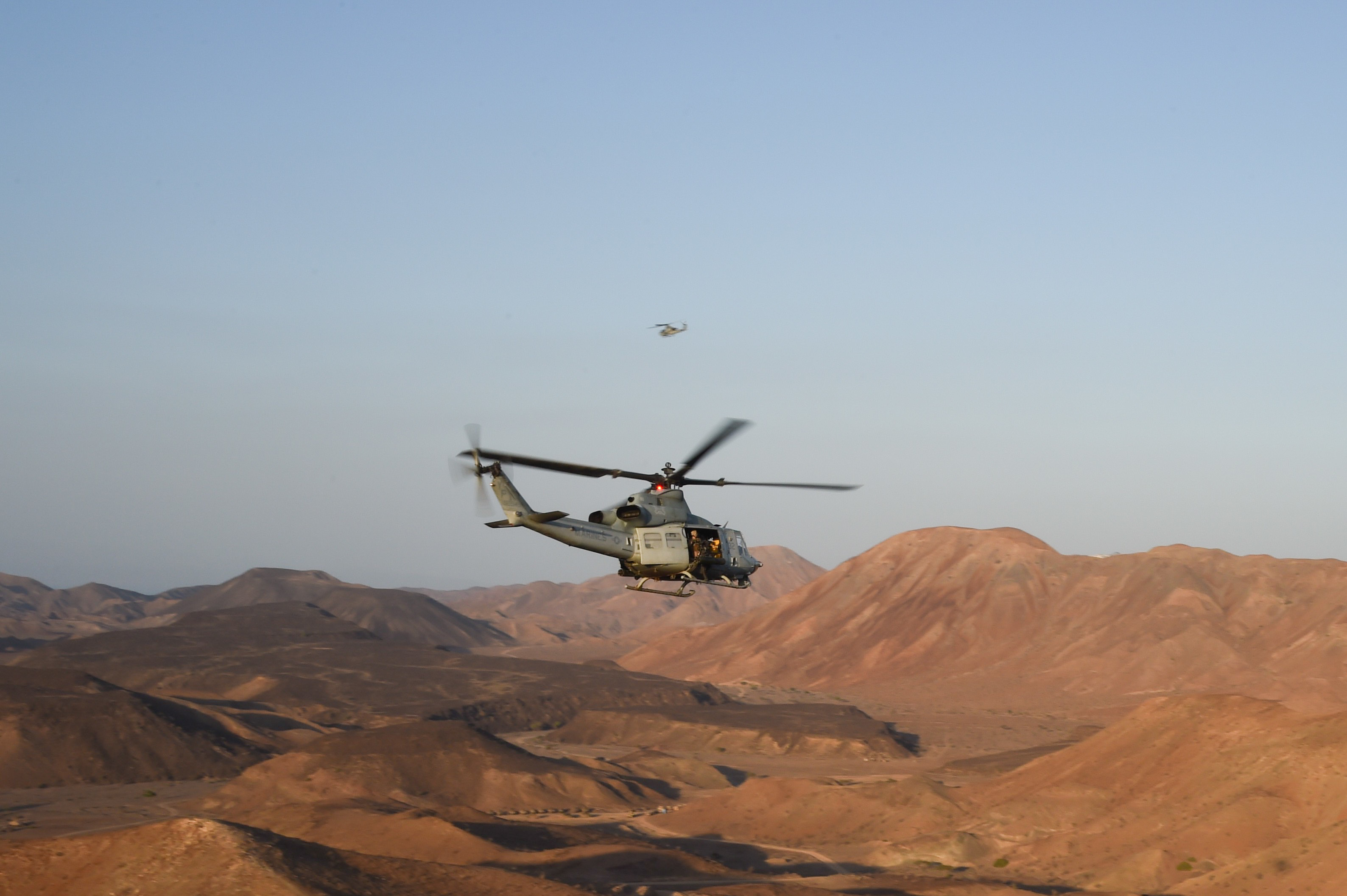 A UH-1Y Huey helicopter flies over the range after a helo-borne raid during Exercise Alligator Dagger, Dec. 18, 2016, at Arta Plage, Djibouti. The exercise allows opportunities for the 11th MEU to maintain their respective skills and proficiencies while intermittently participating in bilateral training with the French. (U.S. Air National Guard photo by Staff Sgt. Penny Snoozy)