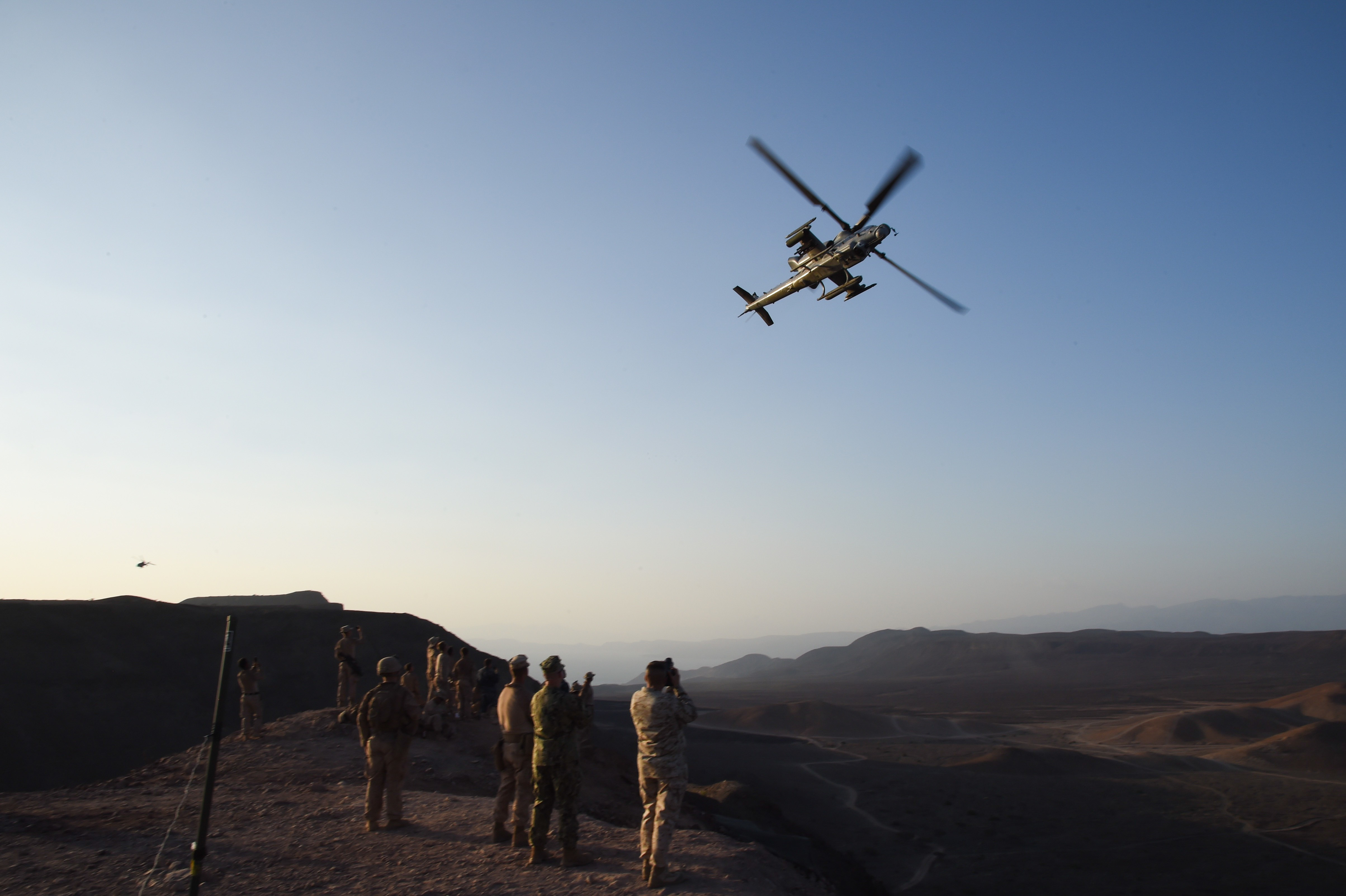 U.S. Marine Corps members with the11th Marine Expeditionary Unit (MEU), and Sailors from the Makin Island Amphibious Ready Group, watch a Super Cobra attack helicopter fly over after a helo-borne raid on the range during Exercise Alligator Dagger, Dec. 18, 2016, at Arta Plage, Djibouti. The exercise allows opportunities for the 11th MEU to maintain their respective skills and proficiencies while intermittently participating in bilateral training with the French. (U.S. Air National Guard photo by Staff Sgt. Penny Snoozy)