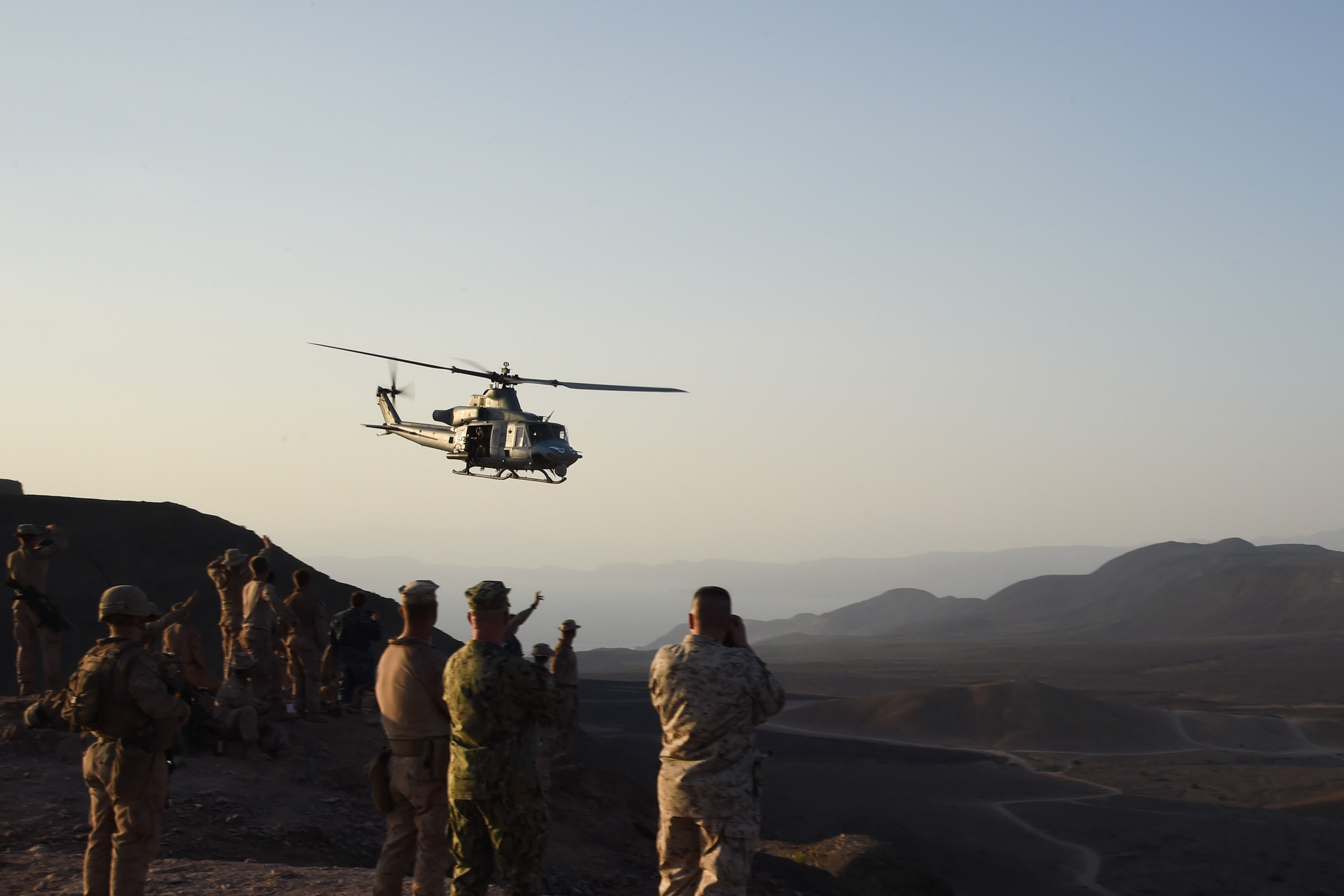 U.S. Marine Corps members with the11th Marine Expeditionary Unit (MEU), and Sailors from the Makin Island Amphibious Ready Group, watch an UH-1Y Huey helicopter fly over after a helo-borne raid on the range during Exercise Alligator Dagger, Dec. 18, 2016, at Arta Plage, Djibouti. The exercise allows opportunities for the 11th MEU to maintain their respective skills and proficiencies while intermittently participating in bilateral training with the French. (U.S. Air National Guard photo by Staff Sgt. Penny Snoozy)