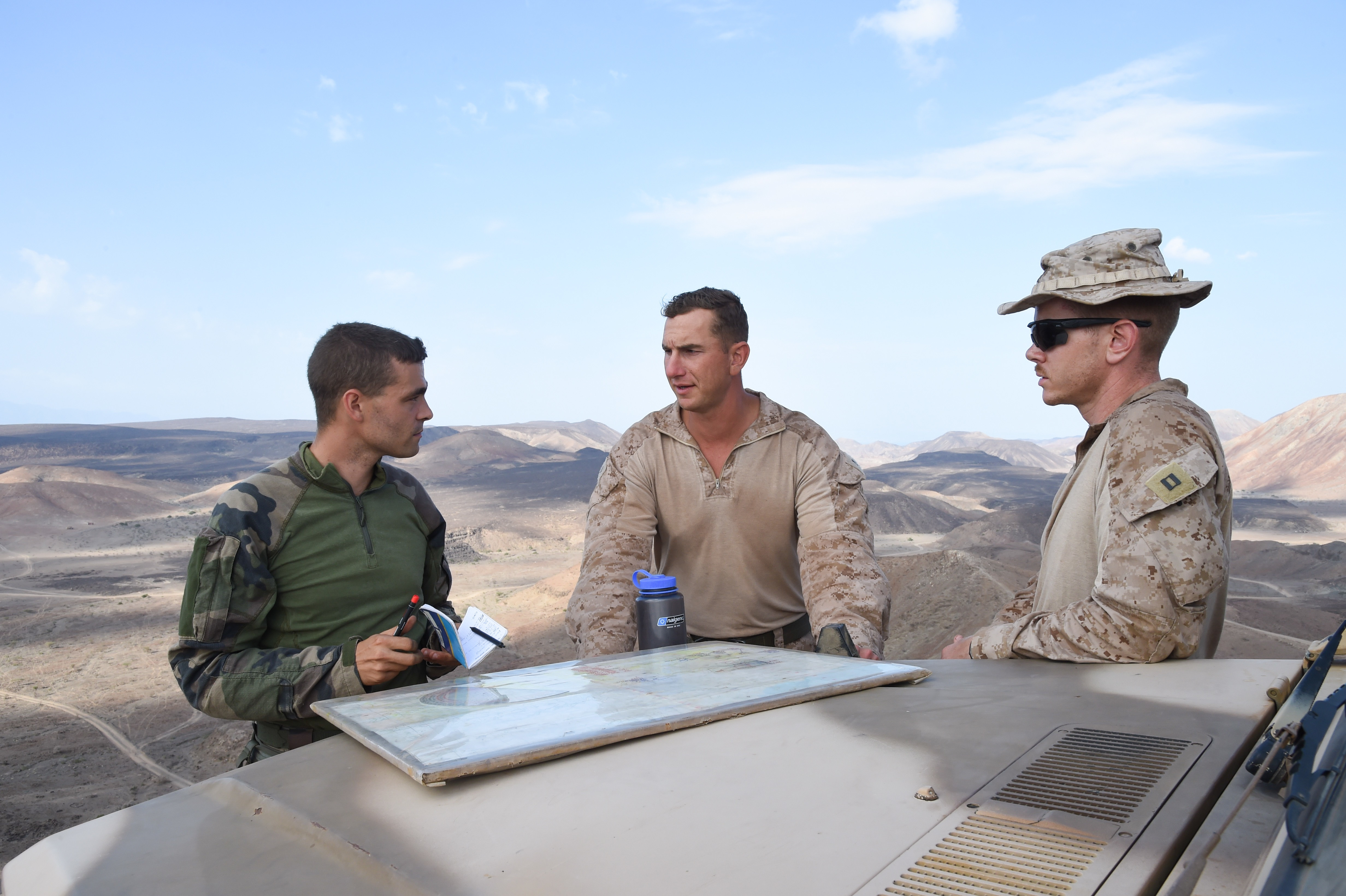 French Marine Capt. A, 6th Support Company commander, and U.S. Marine Corps members with Weapons Company, Battalion Landing Team 1st Battalion, 4th Marines, 11th Marine Expeditionary Unit (MEU), discuss the events to occur on the range during Exercise Alligator Dagger, Dec. 18, 2016, at Arta Plage, Djibouti. The exercise allows opportunities for the 11th MEU to maintain their respective skills and proficiencies while intermittently participating in bilateral training with the French. (U.S. Air National Guard photo by Staff Sgt. Penny Snoozy)